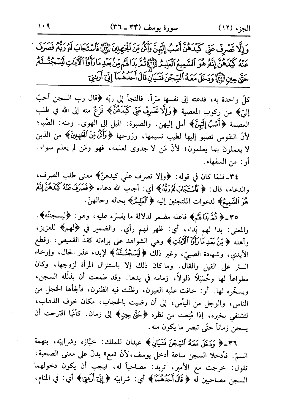 وَدَخَلَ مَعَهُ السِّجْنَ فَتَيَانِ قَالَ أَحَدُهُمَا إِنِّي أَرَانِي أَعْصِرُ خَمْرًا وَقَالَ الْآخَرُ إِنِّي أَرَانِي أَحْمِلُ فَوْقَ رَأْسِي خُبْزًا تَأْكُلُ الطَّيْرُ مِنْهُ نَبِّئْنَا بِتَأْوِيلِهِ إِنَّا نَرَاكَ مِنَ الْمُحْسِنِينَ (36)