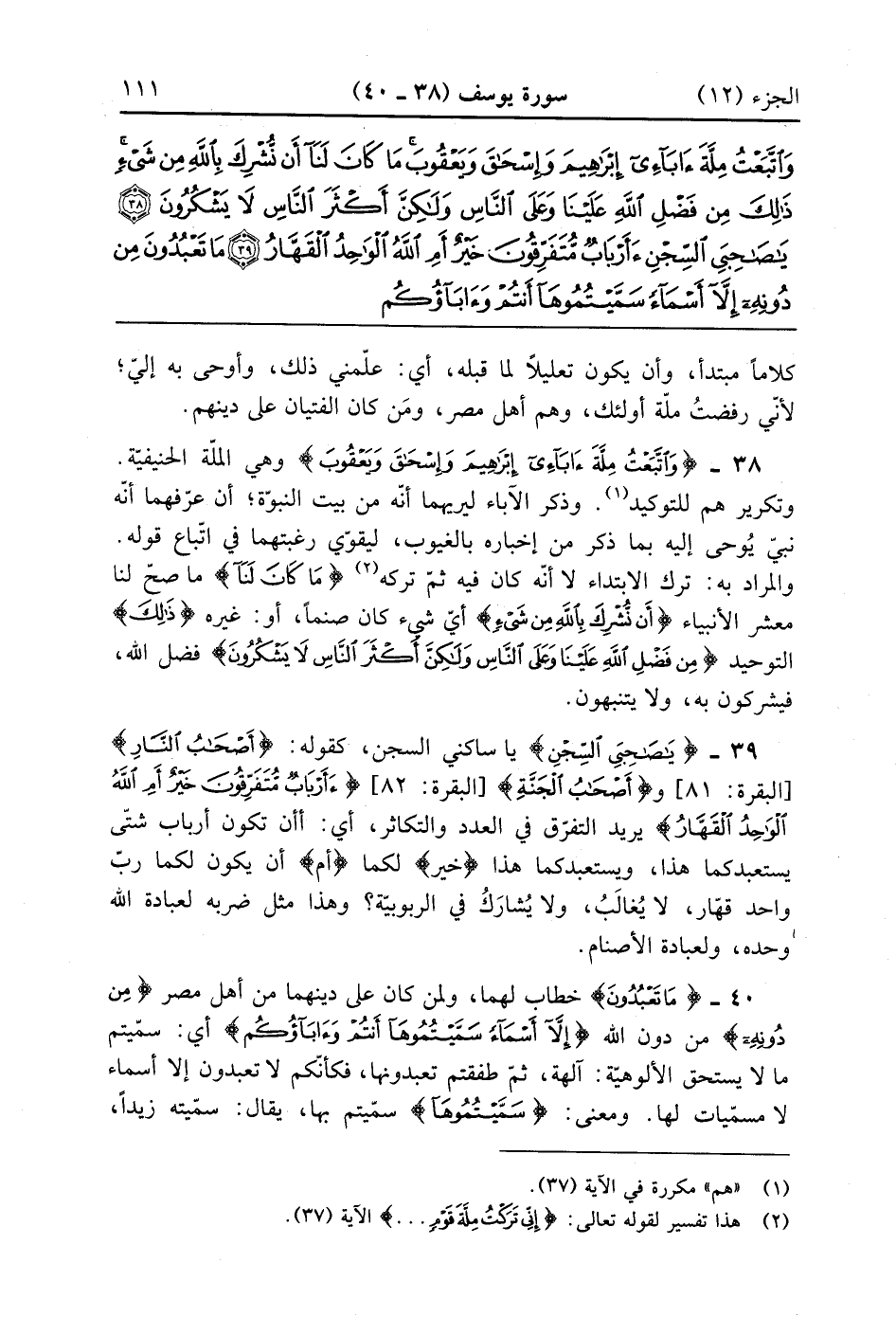 وَاتَّبَعْتُ مِلَّةَ آبَائِي إِبْرَاهِيمَ وَإِسْحَاقَ وَيَعْقُوبَ مَا كَانَ لَنَا أَنْ نُشْرِكَ بِاللَّهِ مِنْ شَيْءٍ ذَلِكَ مِنْ فَضْلِ اللَّهِ عَلَيْنَا وَعَلَى النَّاسِ وَلَكِنَّ أَكْثَرَ النَّاسِ لَا يَشْكُرُونَ (38)