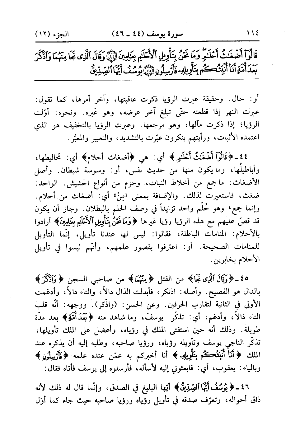 يُوسُفُ أَيُّهَا الصِّدِّيقُ أَفْتِنَا فِي سَبْعِ بَقَرَاتٍ سِمَانٍ يَأْكُلُهُنَّ سَبْعٌ عِجَافٌ وَسَبْعِ سُنْبُلَاتٍ خُضْرٍ وَأُخَرَ يَابِسَاتٍ لَعَلِّي أَرْجِعُ إِلَى النَّاسِ لَعَلَّهُمْ يَعْلَمُونَ (46)