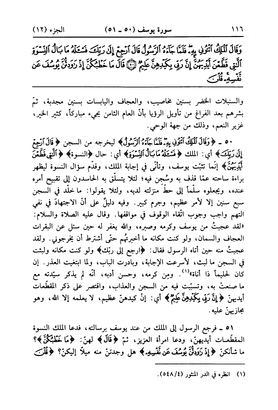 وَقَالَ الْمَلِكُ ائْتُونِي بِهِ فَلَمَّا جَاءَهُ الرَّسُولُ قَالَ ارْجِعْ إِلَى رَبِّكَ فَاسْأَلْهُ مَا بَالُ النِّسْوَةِ اللَّاتِي قَطَّعْنَ أَيْدِيَهُنَّ إِنَّ رَبِّي بِكَيْدِهِنَّ عَلِيمٌ (50)