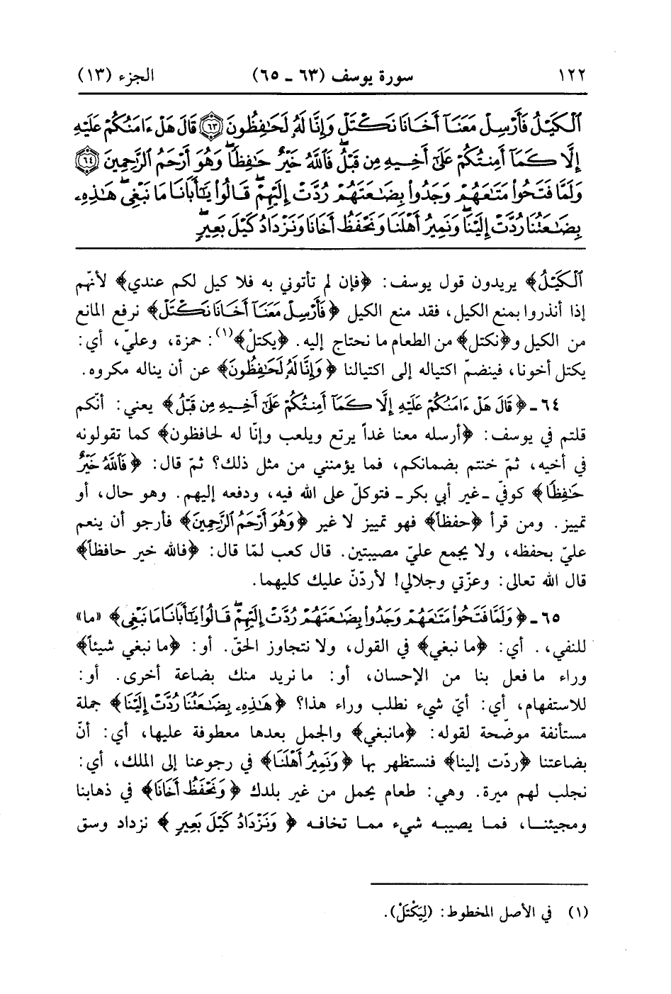 الكيل} يريدون قول يوسف فإن لم تأتون به فلا كيل لكم عندي لأنهم إذا أنذروا بمنع الكيل فقد منع الكيل {فَأَرْسِلْ مَعَنَا أَخَانَا نَكْتَلْ} نرفع المانع من الكيل ونكتل من الطعام ما نحتاج إليه يكتل حمزة وعلي أي يكتل أخوناً فينضم اكتياله إلى اكتيالنا {وَإِنَّا لَهُ لحافظون} عن أن يناله مكروه