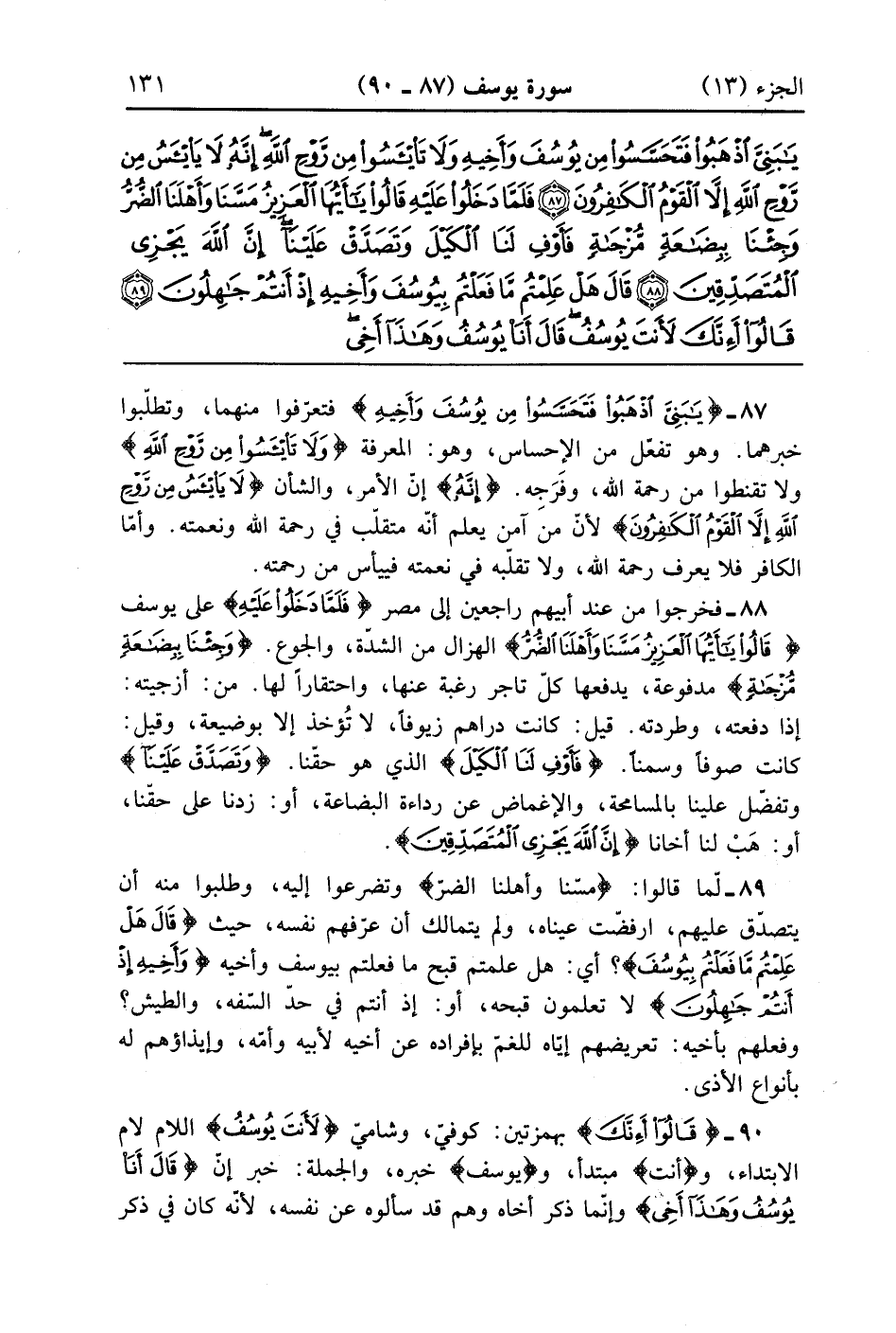 قَالُوا أَإِنَّكَ لَأَنْتَ يُوسُفُ قَالَ أَنَا يُوسُفُ وَهَذَا أَخِي قَدْ مَنَّ اللَّهُ عَلَيْنَا إِنَّهُ مَنْ يَتَّقِ وَيَصْبِرْ فَإِنَّ اللَّهَ لَا يُضِيعُ أَجْرَ الْمُحْسِنِينَ (90)