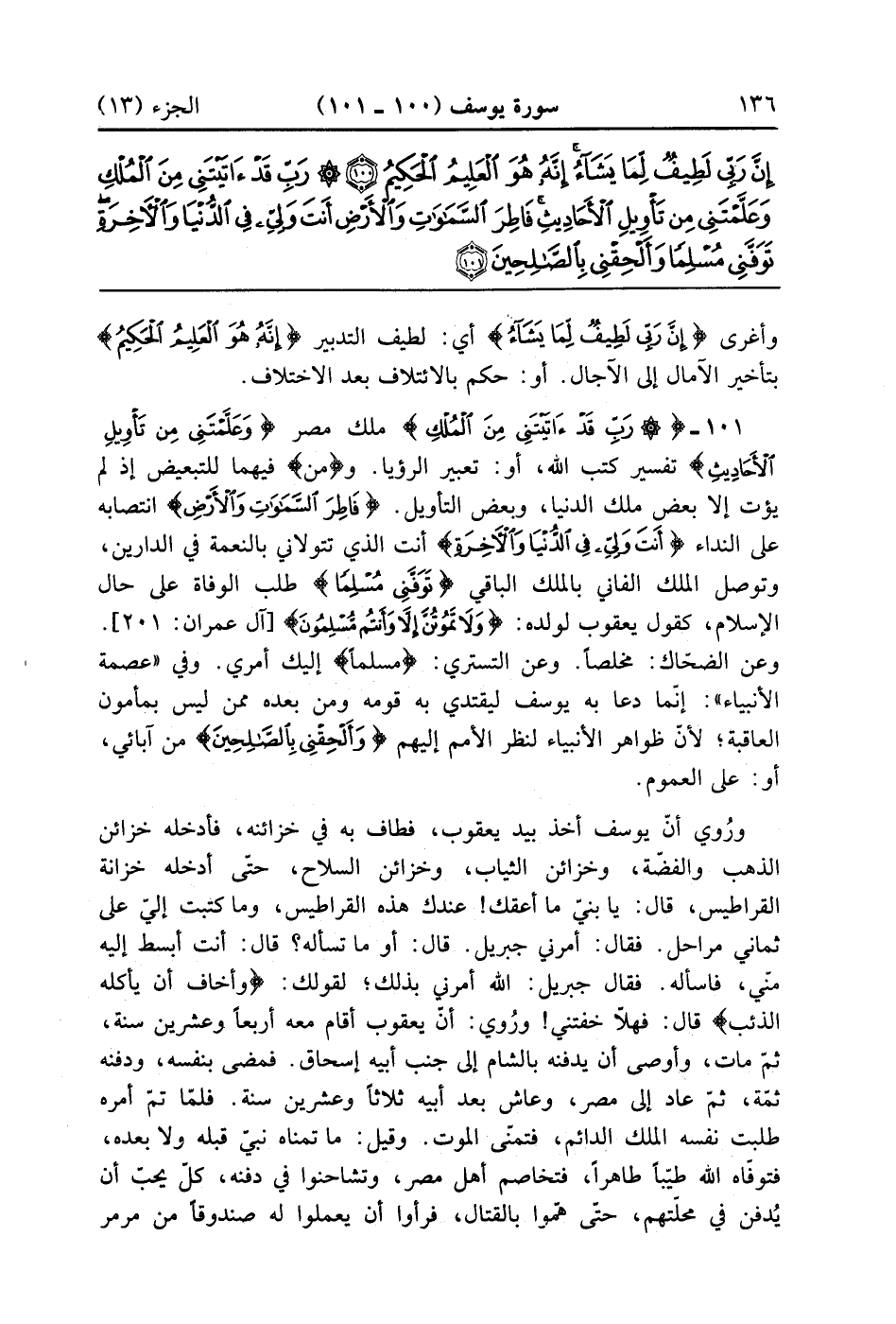 رَبِّ قَدْ آتَيْتَنِي مِنَ الْمُلْكِ وَعَلَّمْتَنِي مِنْ تَأْوِيلِ الْأَحَادِيثِ فَاطِرَ السَّمَاوَاتِ وَالْأَرْضِ أَنْتَ وَلِيِّي فِي الدُّنْيَا وَالْآخِرَةِ تَوَفَّنِي مُسْلِمًا وَأَلْحِقْنِي بِالصَّالِحِينَ (101)