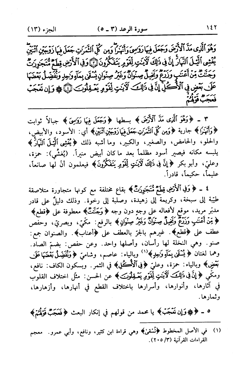 وَفِي الْأَرْضِ قِطَعٌ مُتَجَاوِرَاتٌ وَجَنَّاتٌ مِنْ أَعْنَابٍ وَزَرْعٌ وَنَخِيلٌ صِنْوَانٌ وَغَيْرُ صِنْوَانٍ يُسْقَى بِمَاءٍ وَاحِدٍ وَنُفَضِّلُ بَعْضَهَا عَلَى بَعْضٍ فِي الْأُكُلِ إِنَّ فِي ذَلِكَ لَآيَاتٍ لِقَوْمٍ يَعْقِلُونَ (4)