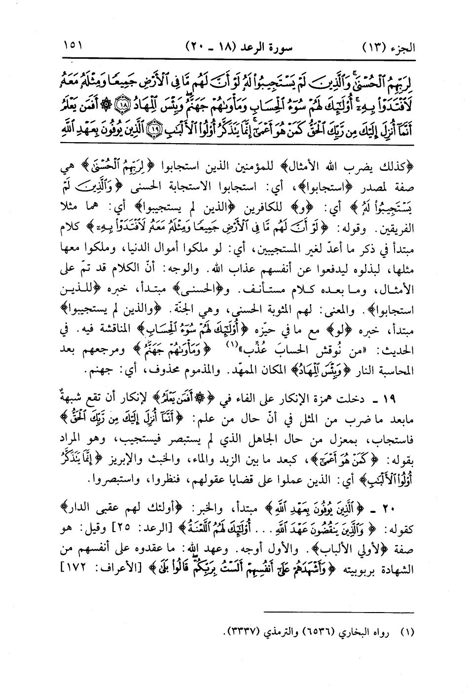 كذلك يضرب اله أمثال للمؤمنين الذين استجابوا {لربهم الحسنى} هي صفة لمصدر استجابوا أي استجابوا الاستجابة الحسنى {والذين لم يستجيبوا له} اي وللكافرين الذين لم يستجيوا أي هما مثلاً الفريقين وقوله {لَوْ أَنَّ لَهُمْ مَّا فِي الأرض جَمِيعاً وَمِثْلَهُ مَعَهُ لاَفْتَدَوْاْ بِهِ} كلام مبتدأ في ذكر ما أعد لغير المستجيبين أي لو ملكوا أموال الدنيا وملكوا معها مثلها لبذلوه ليدفعوا عن أنفسهم عذاب الله والوجه أن الكلام قد تم على الأمثال وما بعده كلام مستأنف والحسنى مبتدأ خبره للذين استجابوا والمعنى لهم المثوبة الحسنى وهي الجنة والذين يستجيبوا مبتدأ خبره لو مع ما في حيزه {أولئك لَهُمْ سُوءُ الحساب}