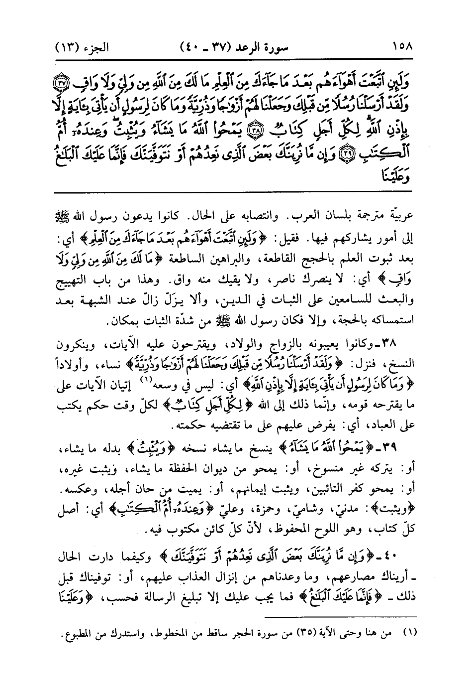 وَلَقَدْ أَرْسَلْنَا رُسُلًا مِنْ قَبْلِكَ وَجَعَلْنَا لَهُمْ أَزْوَاجًا وَذُرِّيَّةً وَمَا كَانَ لِرَسُولٍ أَنْ يَأْتِيَ بِآيَةٍ إِلَّا بِإِذْنِ اللَّهِ لِكُلِّ أَجَلٍ كِتَابٌ (38)