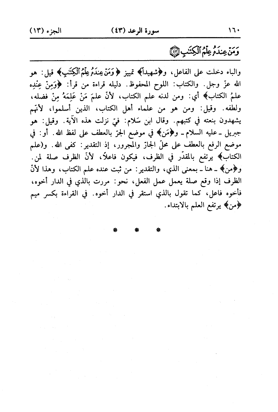 والباء دخلت على الفاعل وشهيدا تمييز {وَمَنْ عِندَهُ عِلْمُ الكتاب} قيل هو الله عز وجل والكتاب اللوح المحفوظ دليله قراءة من قرأ ومن عنده علم الكتاب أي ومن لدنه علم الكتاب لأن علم من علمه من فضله ولطفه وقيل ومن هو من علماء أهل الكتاب الذين أسلموا لأنهم يشهدون بنعته في كتبهم وقال ابن سلام فيّ نزلت هذه الآية وقيل هو جبريل عليه السلام ومن في موضع الجر بالعطف على لفظ الله أو في موضع الرفع بالعطف على محل الجار والمجرور إذ التقدير كفى الله وعلم الكتاب ويرتفع بالمقدر في الظرف فيكون فاعلاً لأن الظرف صلة لمن ومن هنا بمعنى الذي والتقدير من ثبت عنده علم الكتاب وهذا لأن الظرف إذا وقع صلة يعمل عمل الفعل نحو مررت بالذي في الدار أخوه فأخوه فاعل كما تقول بالذي استقر في الدار أخوه وفي القراءة بكسر ميم من يرتفع العلم بالابتداء