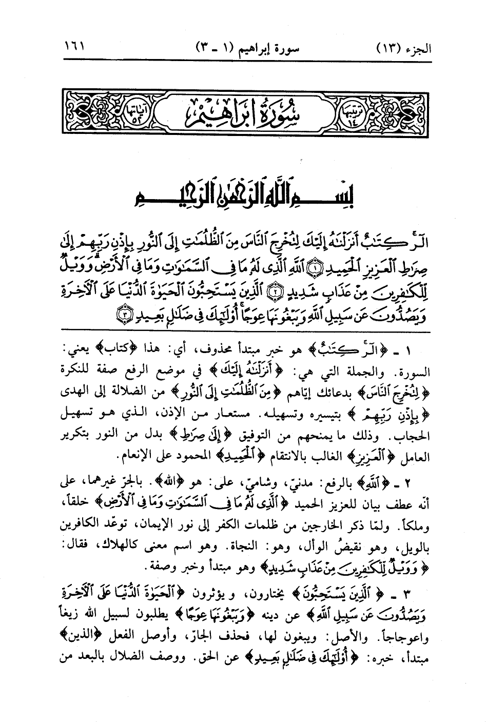 الر كِتَابٌ أَنْزَلْنَاهُ إِلَيْكَ لِتُخْرِجَ النَّاسَ مِنَ الظُّلُمَاتِ إِلَى النُّورِ بِإِذْنِ رَبِّهِمْ إِلَى صِرَاطِ الْعَزِيزِ الْحَمِيدِ (1)