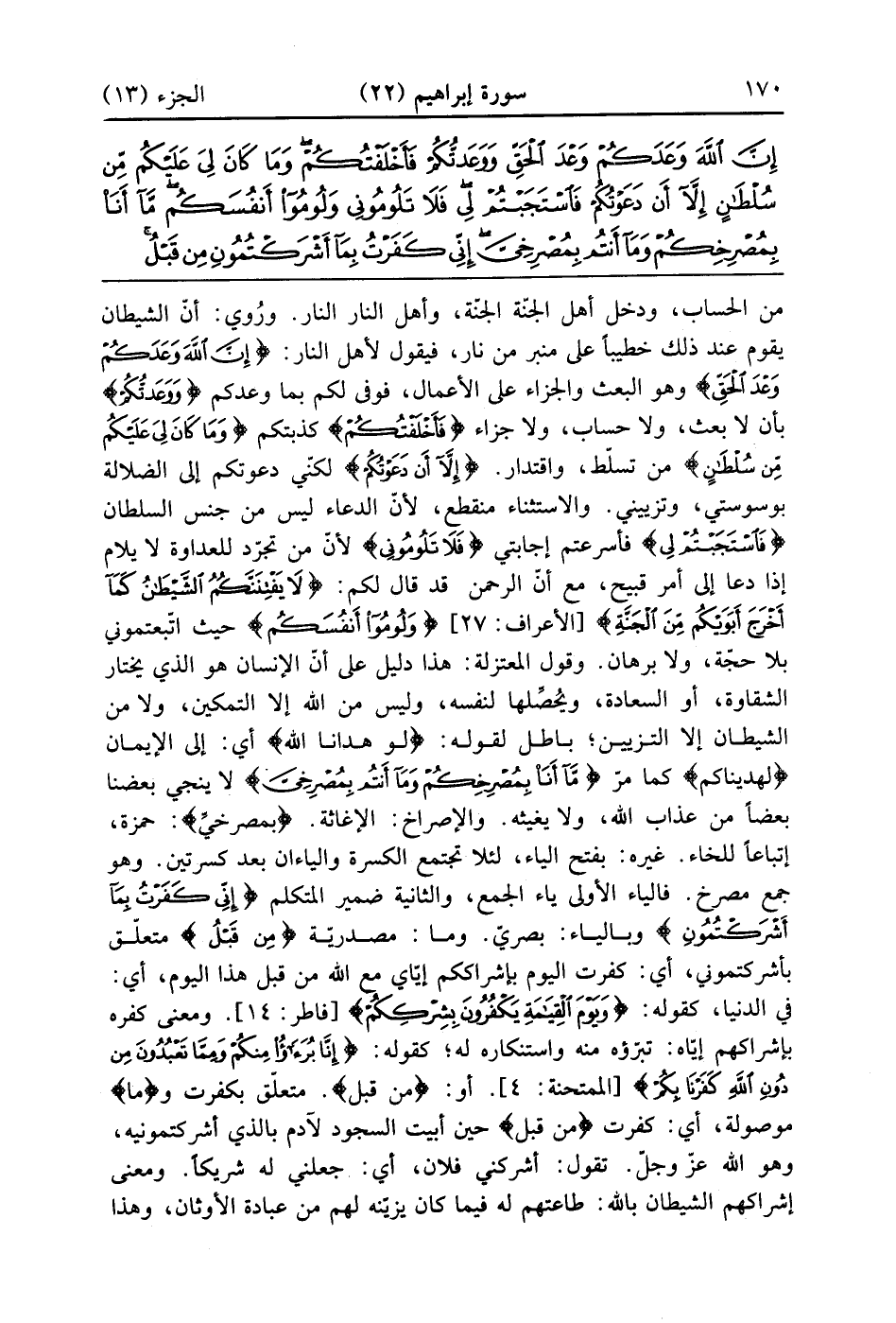 {وَلُومُواْ أَنفُسَكُمْ} حيث اتبعتموني بلا حجة ولا برهان وقول المعتزلة هذا دليل على أن الإنسان هو الذي يختار الشقاوة أو السعادة ويحصلها لنفسه وليس من الله إلا التمكين ولا من الشيطان إلا التزيين باطل لقوله لو هدانا الله اي إلى الايمان لهدينا كم كما مر {مَّا أَنَاْ بِمُصْرِخِكُمْ وَمَا أَنتُمْ بِمُصْرِخِيَّ} لا ينجي بعضنا بعضاً من عذاب الله ولا يغيثه والا صراخ الإغاثة بمصرخيِّ حمزة اتباعاً للخاء غيره بفتح الياء لئلا تجتمع الكسرة واليآن بعد كسرتين وهو جمع مصرخ فالياء الأولى ياء الجمع والثانية ضمير المتكلم {إِنّي كَفَرْتُ بِمَا أشركتمون} وبالياء بصرى وما مصدرية {من قبل} متعلق بأشركتمونى أي كفرت اليوم بإشراككم إياي مع الله من قبل هذا اليوم أي في الدنيا كقوله ويوم القيامة يكفرون بشرككم ومعنى كفره بإشراكهم إياه تبرؤه منه واستنكاره له كقوله أَنَاْ بَرَاء مّنْكُمْ وَمِمَّا تَعْبُدُونَ مِن دُونِ الله كَفَرْنَا بِكُمْ أو من قبل متعلق بكفرت وما موصولة أي كفرت من قبل حين أبيت السجود لآدم بالذي اشركتمونيه وهو الله عز وجل تقول أشركني فلان أي جعلني له شريكاً ومعنى إشراكهم الشيطان يالله طاعتهم له فيما كان يزينه لهم من عبادة الأوثان وهذا