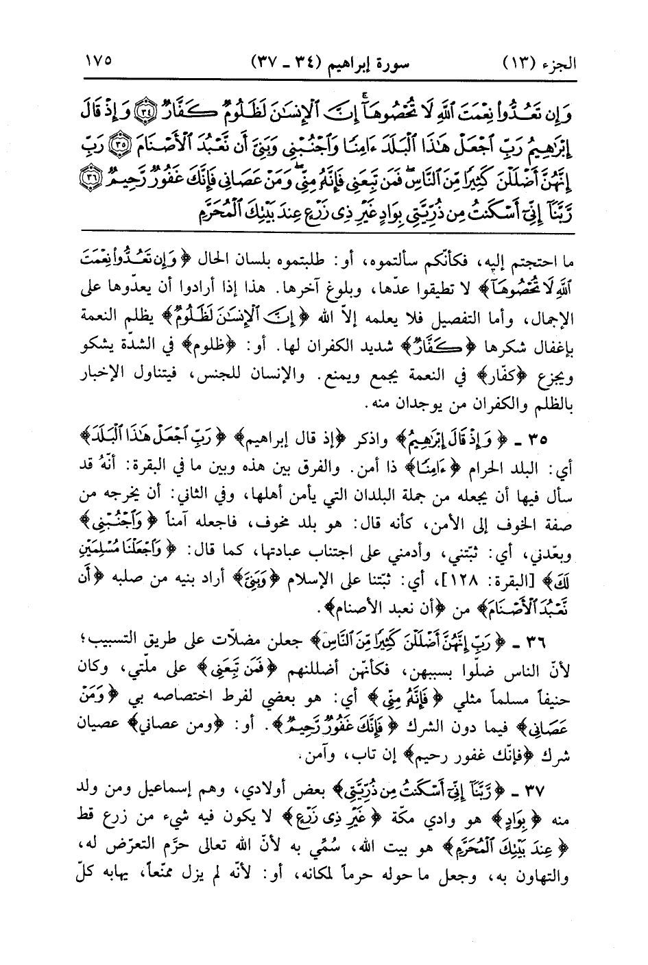 وَإِذْ قَالَ إِبْرَاهِيمُ رَبِّ اجْعَلْ هَذَا الْبَلَدَ آمِنًا وَاجْنُبْنِي وَبَنِيَّ أَنْ نَعْبُدَ الْأَصْنَامَ (35)