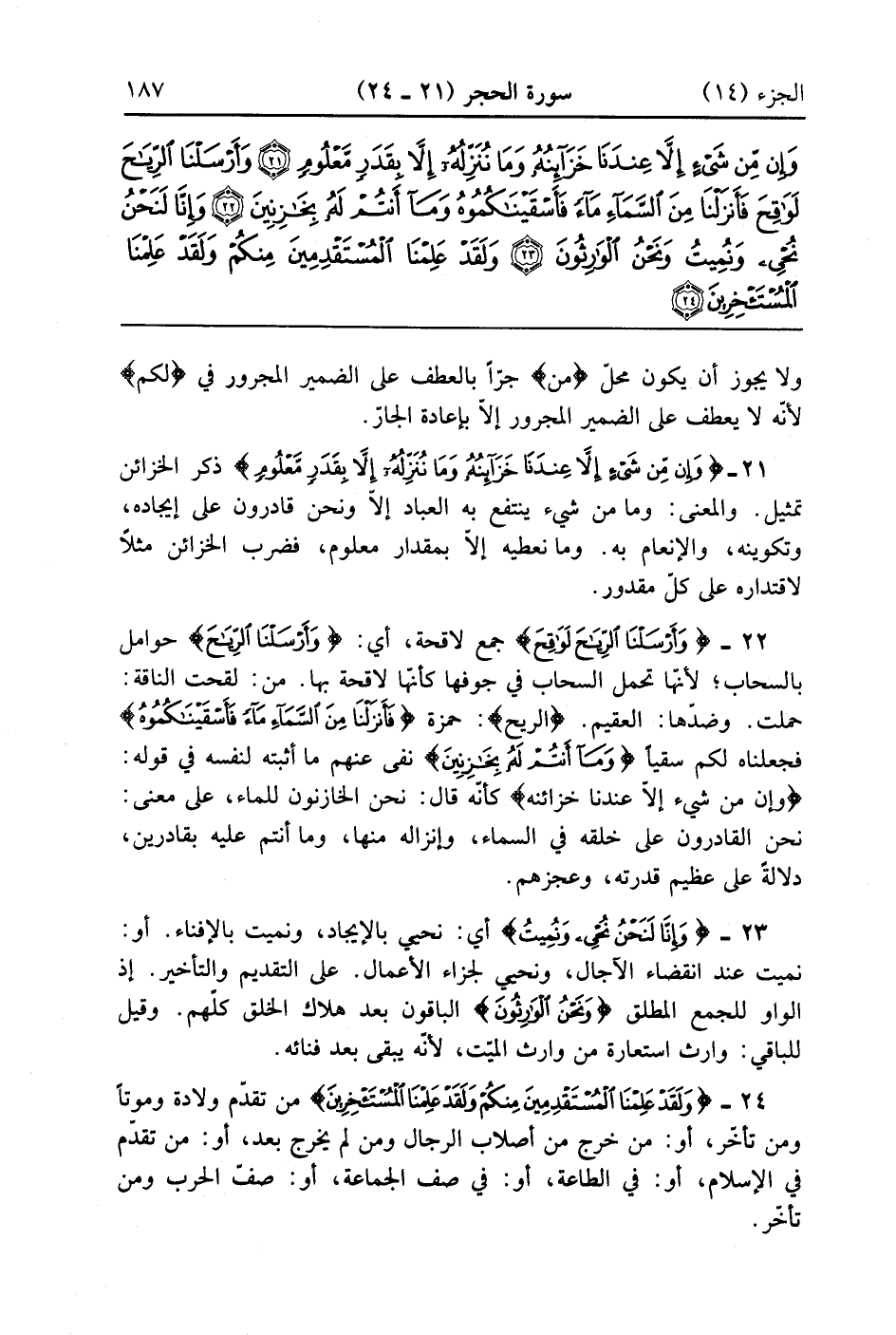 {وَإِن مِّن شَىْءٍ إِلاَّ عِندَنَا خَزَائِنُهُ وَمَا نُنَزِّلُهُ إِلاَّ بِقَدَرٍ مَّعْلُومٍ} ذكر الخزائن تمثيل والمعنى وما من شيء ينتفع به العباد إلا ونحن قادرون على إيجاده وتكوينه والإنعام به وما نعطيه إلا بمقدار معلوم فضرب الخزائن مثلاً لاقتداره على كل مقدور