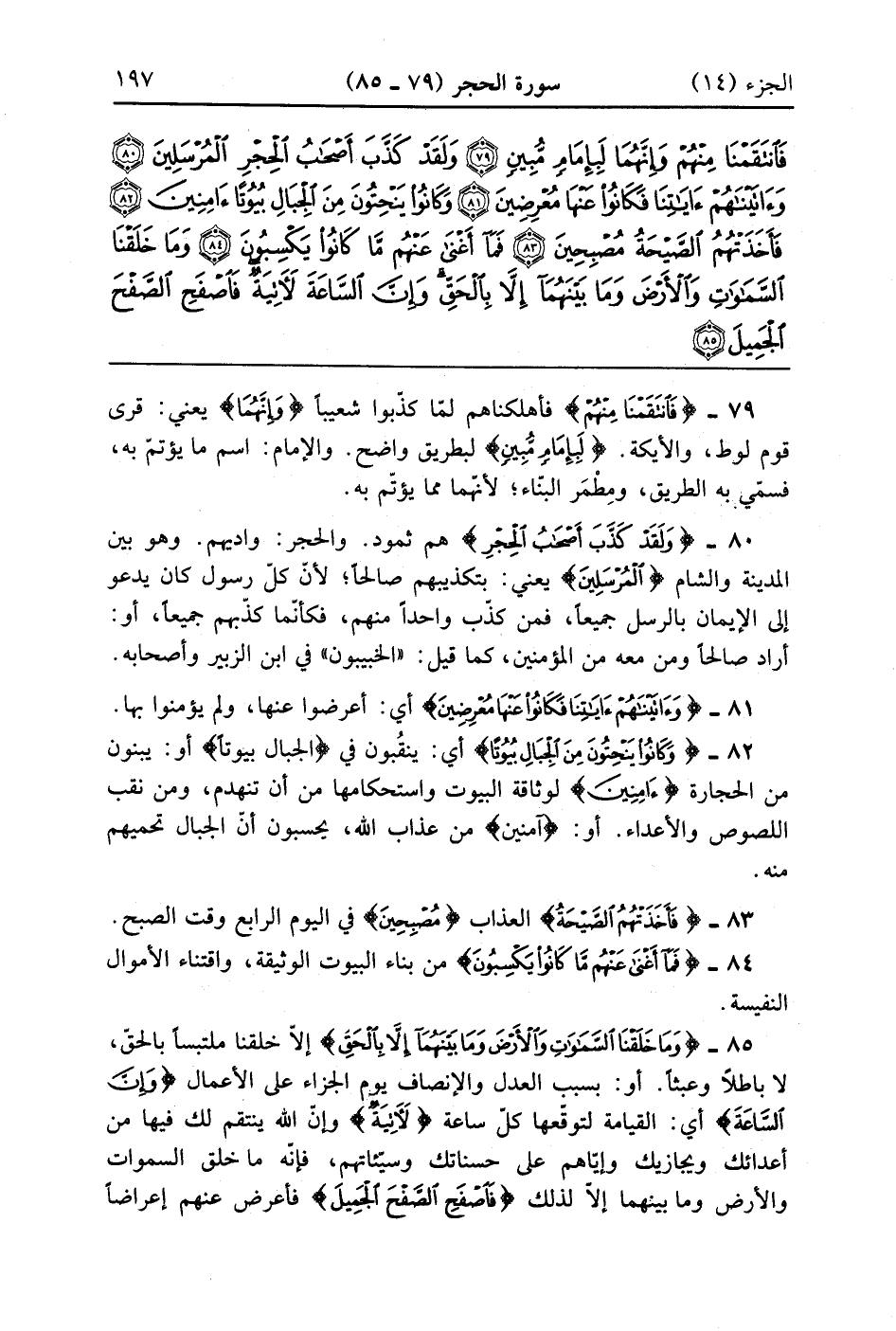 {وَلَقَدْ كَذَّبَ أصحاب الحجر المرسلين} هم ثمود والحجر واديهم وهو بين المدينة والشام المرسلين يعني بتكذيبهم صالحاً لأن كل رسول كان يدعو إلى الإيمان بالرسل جميعاً فمن كذب واحداً منهم فكأنما كذبهم جميعاً أو أراد صالحاً ومن معه من المؤمنين كما قيل الخبيبيون في ابن الزبير واصحابه