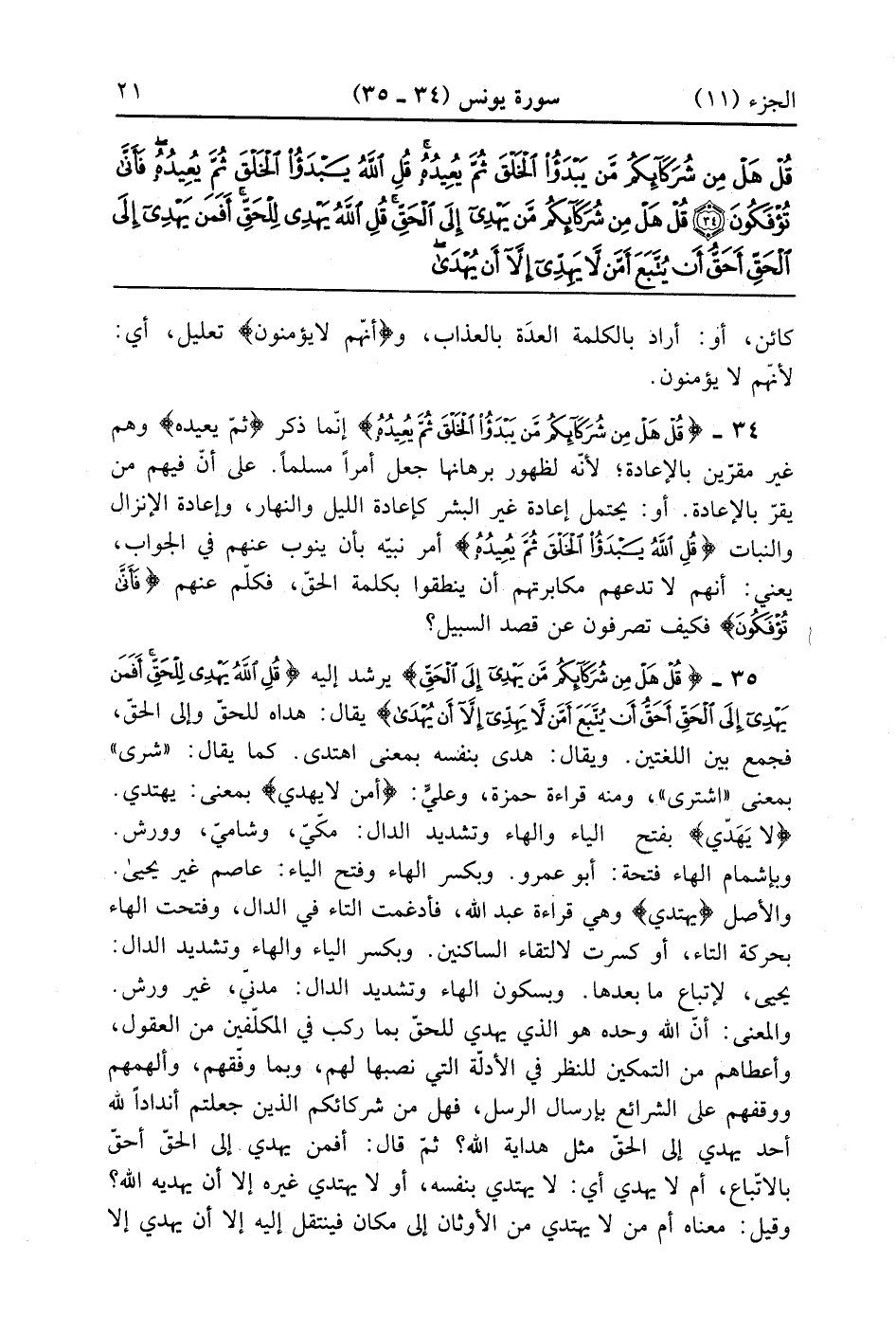 قُلْ هَلْ مِنْ شُرَكَائِكُمْ مَنْ يَهْدِي إِلَى الْحَقِّ قُلِ اللَّهُ يَهْدِي لِلْحَقِّ أَفَمَنْ يَهْدِي إِلَى الْحَقِّ أَحَقُّ أَنْ يُتَّبَعَ أَمَّنْ لَا يَهِدِّي إِلَّا أَنْ يُهْدَى فَمَا لَكُمْ كَيْفَ تَحْكُمُونَ (35)