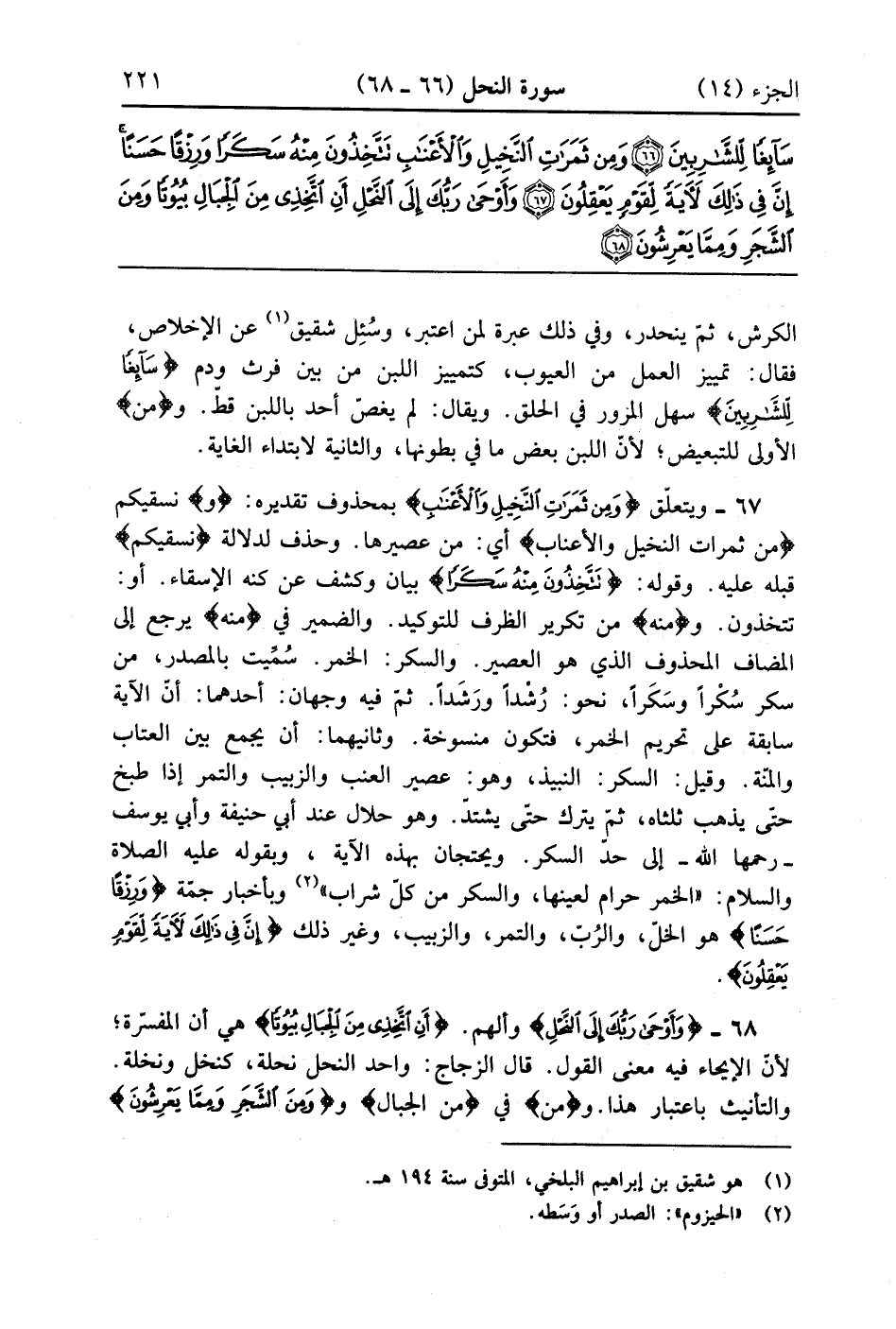 وَمِنْ ثَمَرَاتِ النَّخِيلِ وَالْأَعْنَابِ تَتَّخِذُونَ مِنْهُ سَكَرًا وَرِزْقًا حَسَنًا إِنَّ فِي ذَلِكَ لَآيَةً لِقَوْمٍ يَعْقِلُونَ (67)