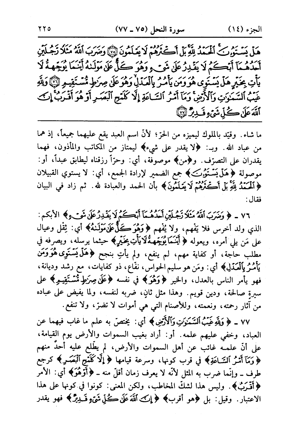 وَضَرَبَ اللَّهُ مَثَلًا رَجُلَيْنِ أَحَدُهُمَا أَبْكَمُ لَا يَقْدِرُ عَلَى شَيْءٍ وَهُوَ كَلٌّ عَلَى مَوْلَاهُ أَيْنَمَا يُوَجِّهْهُ لَا يَأْتِ بِخَيْرٍ هَلْ يَسْتَوِي هُوَ وَمَنْ يَأْمُرُ بِالْعَدْلِ وَهُوَ عَلَى صِرَاطٍ مُسْتَقِيمٍ (76)