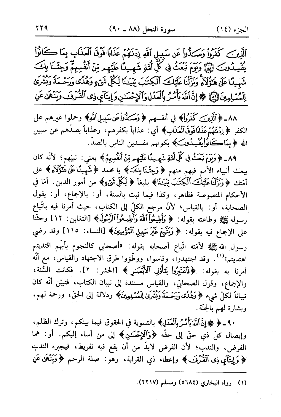 وَيَوْمَ نَبْعَثُ فِي كُلِّ أُمَّةٍ شَهِيدًا عَلَيْهِمْ مِنْ أَنْفُسِهِمْ وَجِئْنَا بِكَ شَهِيدًا عَلَى هَؤُلَاءِ وَنَزَّلْنَا عَلَيْكَ الْكِتَابَ تِبْيَانًا لِكُلِّ شَيْءٍ وَهُدًى وَرَحْمَةً وَبُشْرَى لِلْمُسْلِمِينَ (89)