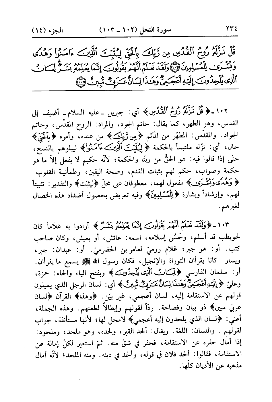 قُلْ نَزَّلَهُ رُوحُ الْقُدُسِ مِنْ رَبِّكَ بِالْحَقِّ لِيُثَبِّتَ الَّذِينَ آمَنُوا وَهُدًى وَبُشْرَى لِلْمُسْلِمِينَ (102)