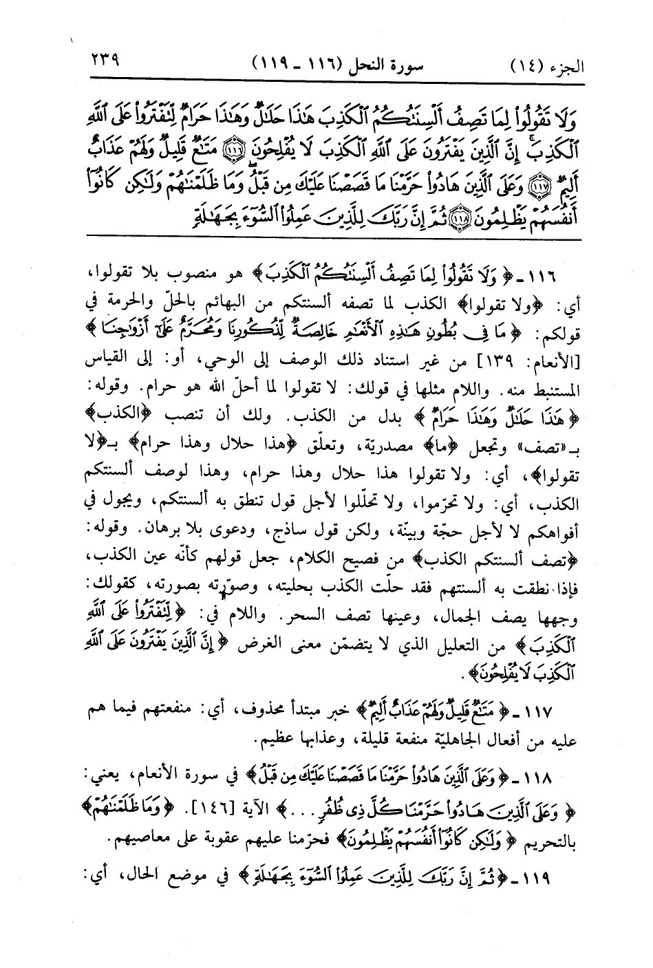 وَلَا تَقُولُوا لِمَا تَصِفُ أَلْسِنَتُكُمُ الْكَذِبَ هَذَا حَلَالٌ وَهَذَا حَرَامٌ لِتَفْتَرُوا عَلَى اللَّهِ الْكَذِبَ إِنَّ الَّذِينَ يَفْتَرُونَ عَلَى اللَّهِ الْكَذِبَ لَا يُفْلِحُونَ (116)