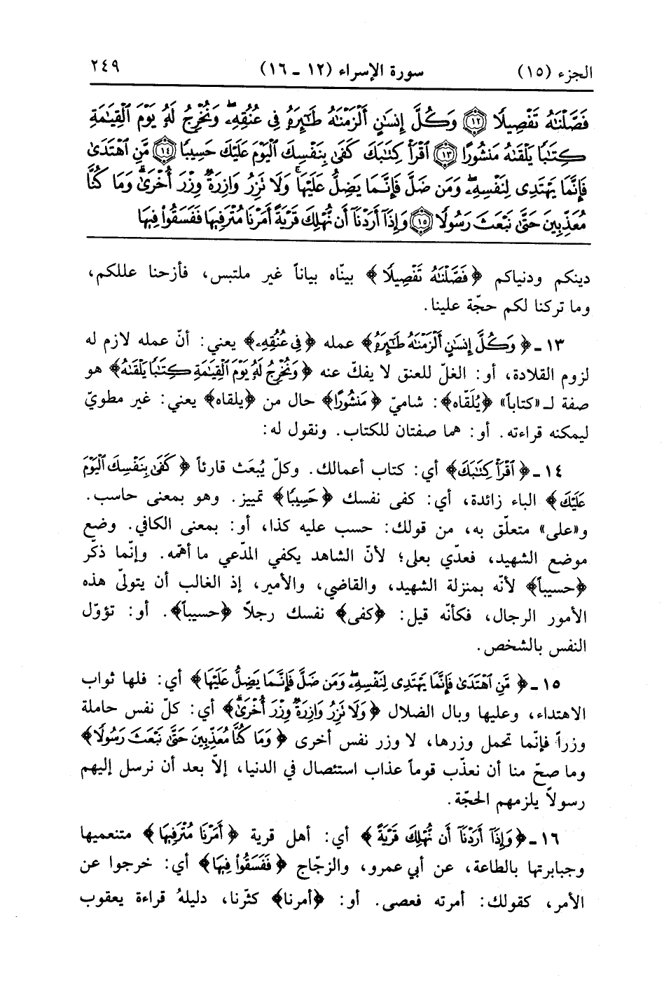 مَنِ اهْتَدَى فَإِنَّمَا يَهْتَدِي لِنَفْسِهِ وَمَنْ ضَلَّ فَإِنَّمَا يَضِلُّ عَلَيْهَا وَلَا تَزِرُ وَازِرَةٌ وِزْرَ أُخْرَى وَمَا كُنَّا مُعَذِّبِينَ حَتَّى نَبْعَثَ رَسُولًا (15)