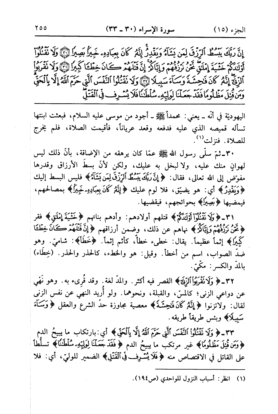 وَلَا تَقْتُلُوا النَّفْسَ الَّتِي حَرَّمَ اللَّهُ إِلَّا بِالْحَقِّ وَمَنْ قُتِلَ مَظْلُومًا فَقَدْ جَعَلْنَا لِوَلِيِّهِ سُلْطَانًا فَلَا يُسْرِفْ فِي الْقَتْلِ إِنَّهُ كَانَ مَنْصُورًا (33)