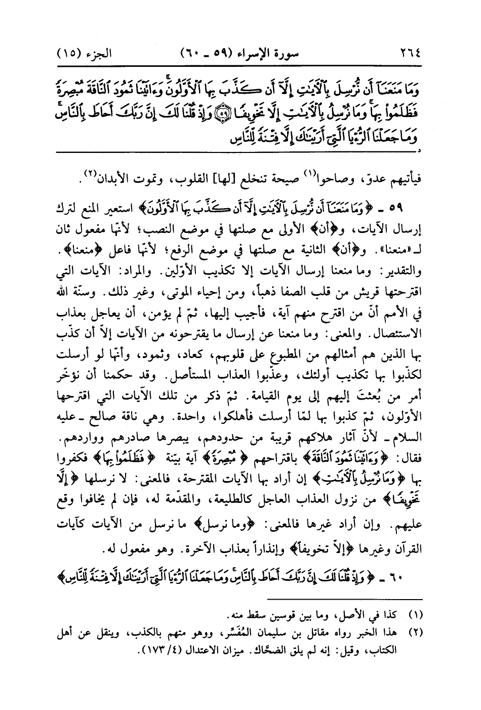 وَمَا مَنَعَنَا أَنْ نُرْسِلَ بِالْآيَاتِ إِلَّا أَنْ كَذَّبَ بِهَا الْأَوَّلُونَ وَآتَيْنَا ثَمُودَ النَّاقَةَ مُبْصِرَةً فَظَلَمُوا بِهَا وَمَا نُرْسِلُ بِالْآيَاتِ إِلَّا تَخْوِيفًا (59)