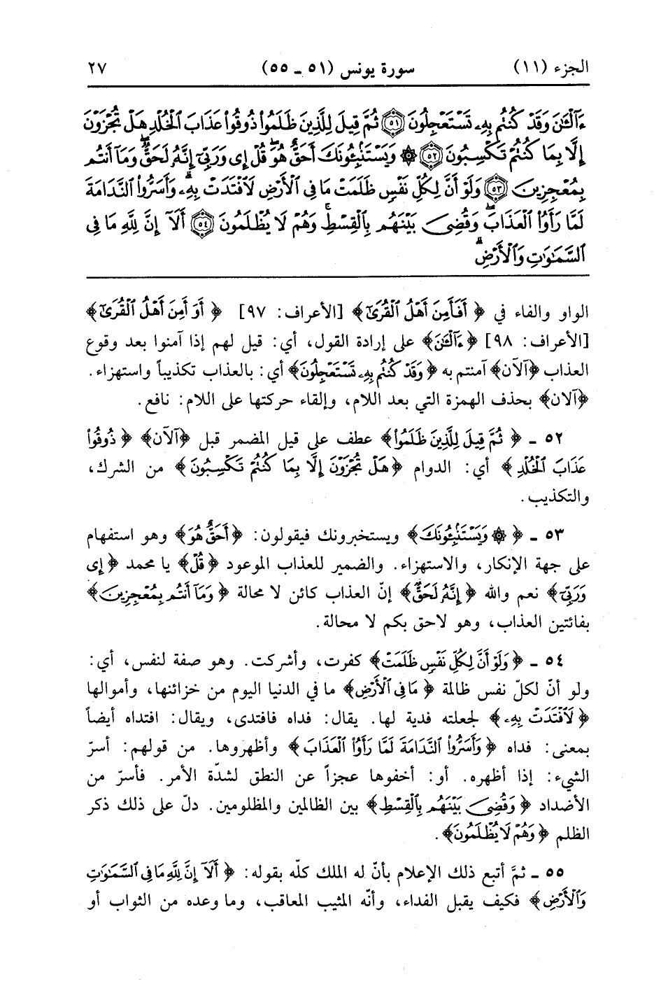 الواو والفاء في أفأمن أهل القرى أو أمن أهل القرى {الآن} على إرادة القول أي قيل لهم إذا آمنوا بعد وقوع العذاب آلآن آمنتم به {وَقَدْ كُنتُم بِهِ تَسْتَعْجِلُونَ} َأي بالعذاب تكذيباً واستهزاء آلان بحذف الهمزة التي بعد اللام وإلقاء حركتها على اللام نافع