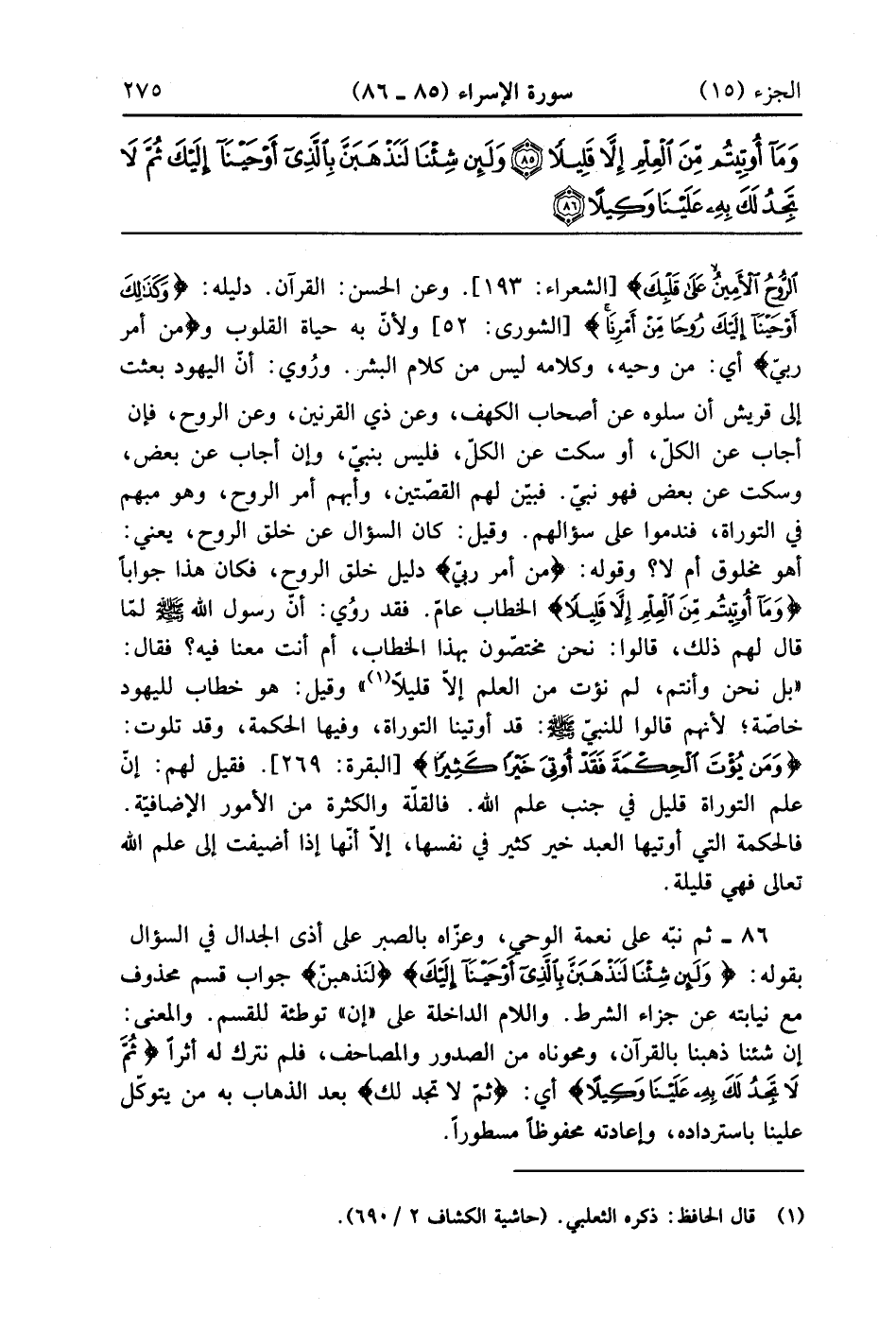 الروح الأمين على قلبك وعن الحسن القرآن دليله وكذلك أوحينا إليك روحا من أمرنا ولأن به حياة القلوب ومن أمر ربي أي من وحيه وكلامه ليس من كلام البشر ورُوي أن اليهود بعثت إلى قريش أن سلوه عن أصحاب الكهف وعن ذي القرنين وعن الروح فإن أجاب عن الكل أوسكت عن الكل فليس بنبي وإن أجاب عن بعض وسكت عن بعض فهو نبي فبين لهم القصتين وأبهم أمر الروح وهو مبهم في التوارة فندموا على سؤالهم وقيل كان السؤال عن خلق الروح يعني أهو مخلوق أم لا وقوله من أمر ربي دليل خلق الروح فكان هذا جواباً {وَمَا أُوتِيتُم مّن العلم إِلاَّ قَلِيلاً} الخطاب عام فقد رُويَّ أن رسول الله صلى الله عليه وسلم لما قال لهم ذلك قالوا نحن مختصون بهذا الخطاب أم أنت معنا فيه فقال بل نحن وأنتم لم نؤت من العلم إلا قليلاً وقيل هو خطاب لليهود خاصة لأنهم قالوا للنبي صلى الله عليه وسلم قد أوتينا التوارة وفيها الحكمة وقد تلوت وَمَن يُؤْتَ الْحِكْمَةَ فقد أوتى خيرا كثيرا فقيل لهم ان علم التوارة قليل في جنب علم الله فالقلة والكثرة من الأمور الإضافية فالحكمة التي أوتيها العبد خير كثير في نفسها إلا أنها إذا أضيفت إلى علم الله تعالى فهي قليلة