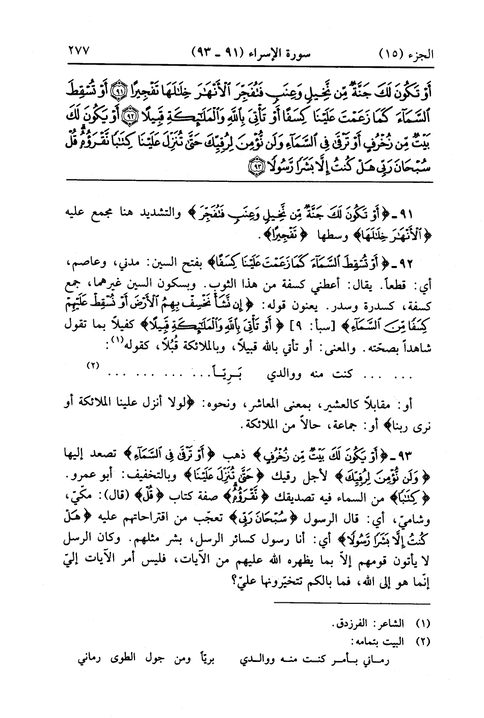 أَوْ يَكُونَ لَكَ بَيْتٌ مِنْ زُخْرُفٍ أَوْ تَرْقَى فِي السَّمَاءِ وَلَنْ نُؤْمِنَ لِرُقِيِّكَ حَتَّى تُنَزِّلَ عَلَيْنَا كِتَابًا نَقْرَؤُهُ قُلْ سُبْحَانَ رَبِّي هَلْ كُنْتُ إِلَّا بَشَرًا رَسُولًا (93)