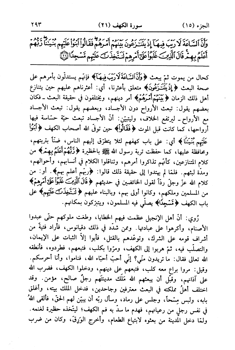 كحال من يموت ثم يبعث {وَأَنَّ الساعة لاَ رَيْبَ فِيهَا} فإنهم يستدلون بأمرهم على صحة البعث {إذ يتنازعون} متعلق باعثرنا أي أعثرناهم عليهم حين يتنازع أهل ذلك الزمان {بَيْنَهُمْ أَمْرَهُمْ} أمر دينهم ويختلفون في حقيقة البعث فكان بعضهم يقول تبعت الأرواح دون الأجساد وبعضم يقول تبعث الأجساد مع الأرواح ليرتفع الخلاف وليتبين أن الأجساد تبعث حية حساسة فيها أرواحها كما كانت قبل الموت {فَقَالُواْ} حين توفى الله أصحاب الكهف {ابنوا عَلَيْهِمْ بنيانا} أي على باب كهفهم لئلا يتطرق إليهم الناس ضناً بتربتهم ومحافظة عليها كما حفظت تربة رسول الله صلى الله عليه وسلم بالحظيرة {رَّبُّهُمْ أَعْلَمُ بِهِمْ} من كلام المتنازعين كأنهم تذاكروا أمرهم وتناقلوا الكلام في أنسابهم وأحوالهم ومدة لبثهم فلما لم يهتدوا إلى حقيقة ذلك قالوا ربهم أعلم بهم أو من كلام الله عز وجل ردا لقول الخائضين في {قَالَ الذين غَلَبُواْ على أَمْرِهِمْ} من المسلمين وملكهم وكانوا أولى بهم وبالبناء عليهم {لَنَتَّخِذَنَّ} باب الكهف {مَّسْجِدًا} يصلي فيه المسلمون ويتبركون بمكانهم روى ان أهل الانجيل
