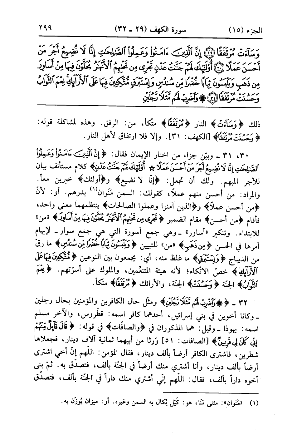 أُولَئِكَ لَهُمْ جَنَّاتُ عَدْنٍ تَجْرِي مِنْ تَحْتِهِمُ الْأَنْهَارُ يُحَلَّوْنَ فِيهَا مِنْ أَسَاوِرَ مِنْ ذَهَبٍ وَيَلْبَسُونَ ثِيَابًا خُضْرًا مِنْ سُنْدُسٍ وَإِسْتَبْرَقٍ مُتَّكِئِينَ فِيهَا عَلَى الْأَرَائِكِ نِعْمَ الثَّوَابُ وَحَسُنَتْ مُرْتَفَقًا (31)