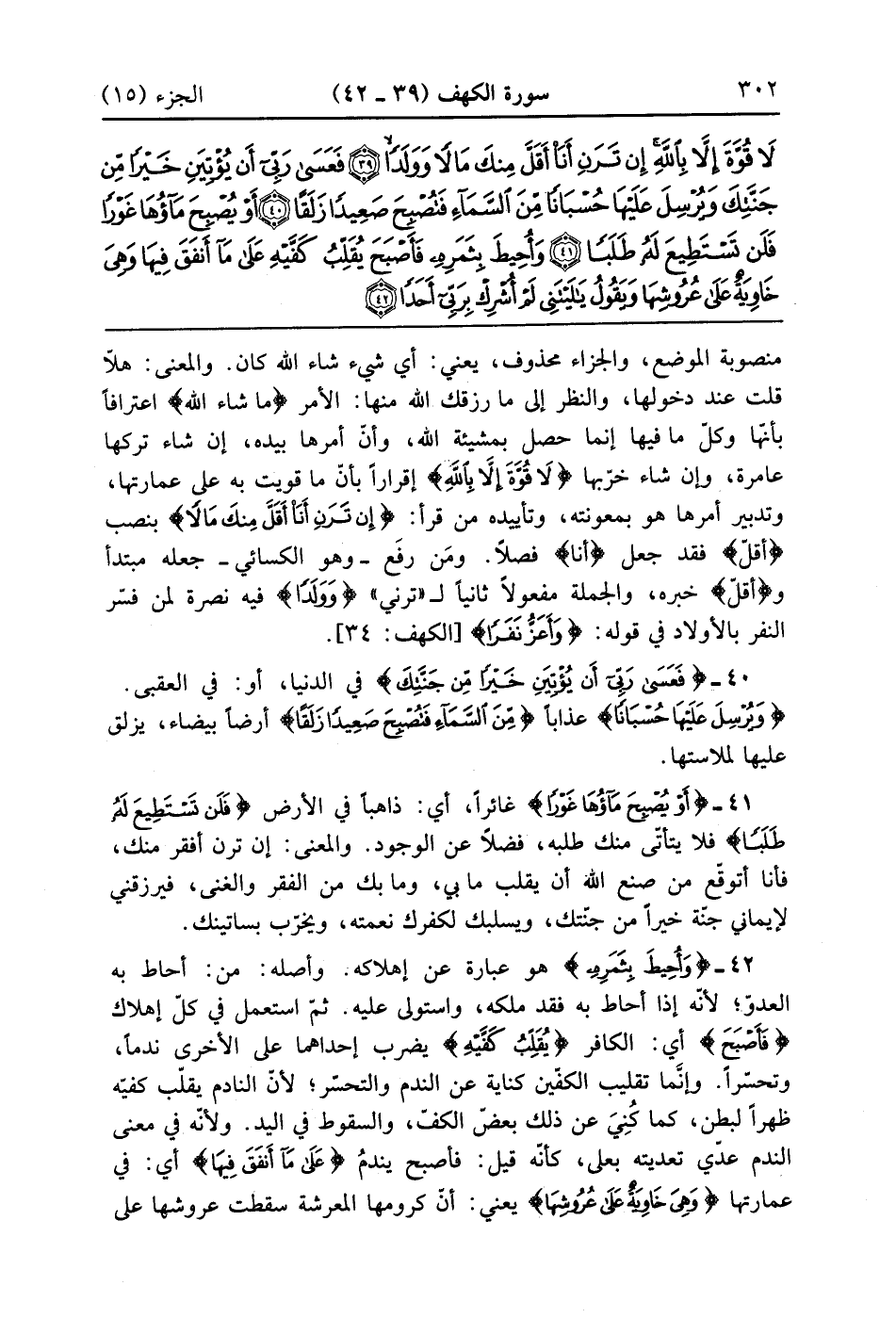 وَأُحِيطَ بِثَمَرِهِ فَأَصْبَحَ يُقَلِّبُ كَفَّيْهِ عَلَى مَا أَنْفَقَ فِيهَا وَهِيَ خَاوِيَةٌ عَلَى عُرُوشِهَا وَيَقُولُ يَا لَيْتَنِي لَمْ أُشْرِكْ بِرَبِّي أَحَدًا (42)