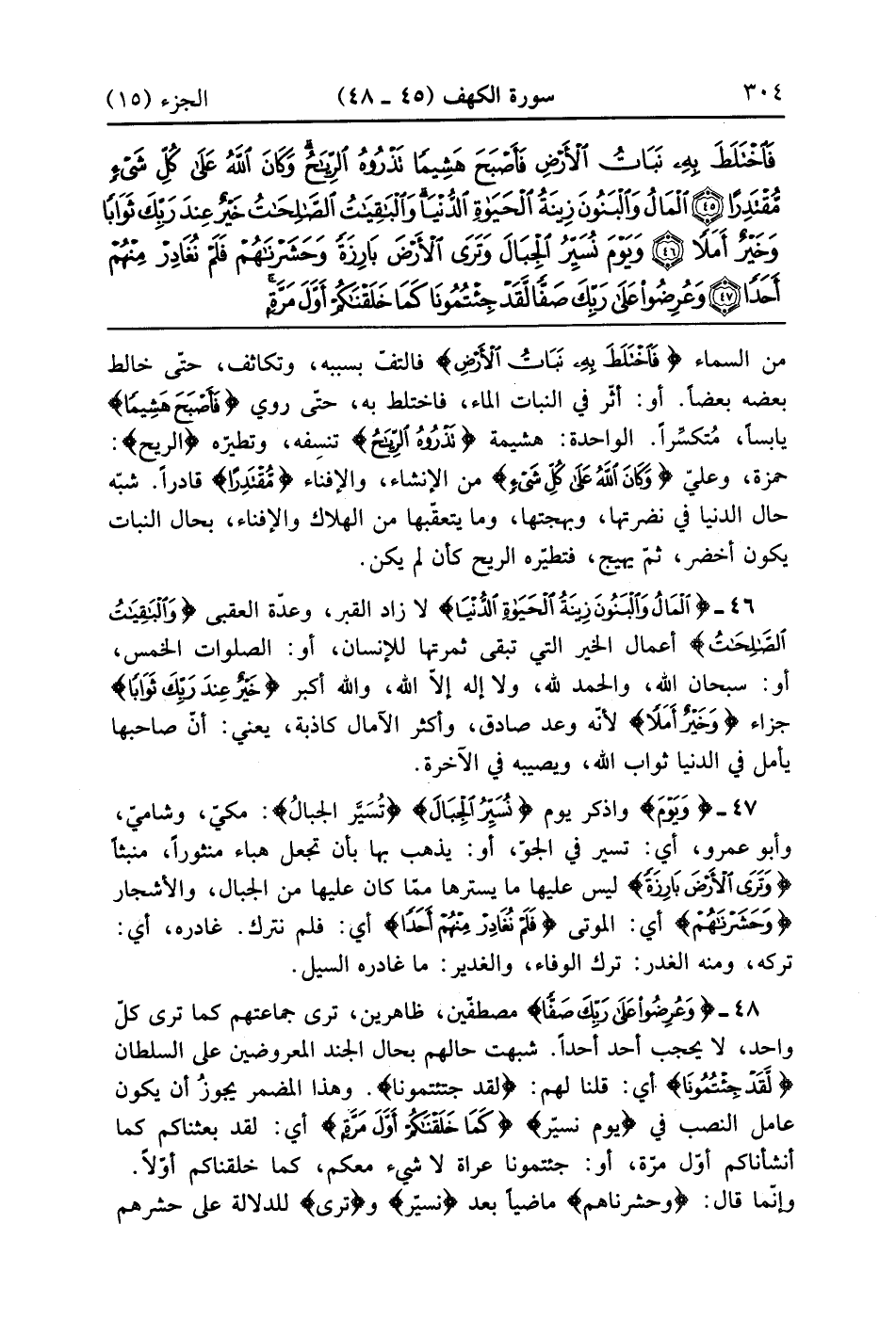 {المال والبنون زِينَةُ الحياة الدنيا} لا زاد القبر وعدة العقبى {والباقيات الصالحات} أعمال الخير التي تبقى ثمرتها للإنسان أو الصلوات الخمس أو سبحان الله والحمد لله ولا إله إلا الله والله أكبر {خَيْرٌ عِندَ رَبّكَ ثَوَابًا} جزاء {وَخَيْرٌ أَمَلاً} لأنه وعد صادق وأكثر الآمال كاذبه يعني أن صاحبها يأمل في الدنيا ثواب الله ويصيبه في الآخرة