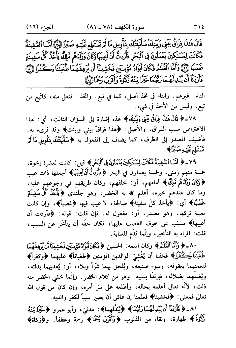 أَمَّا السَّفِينَةُ فَكَانَتْ لِمَسَاكِينَ يَعْمَلُونَ فِي الْبَحْرِ فَأَرَدْتُ أَنْ أَعِيبَهَا وَكَانَ وَرَاءَهُمْ مَلِكٌ يَأْخُذُ كُلَّ سَفِينَةٍ غَصْبًا (79)