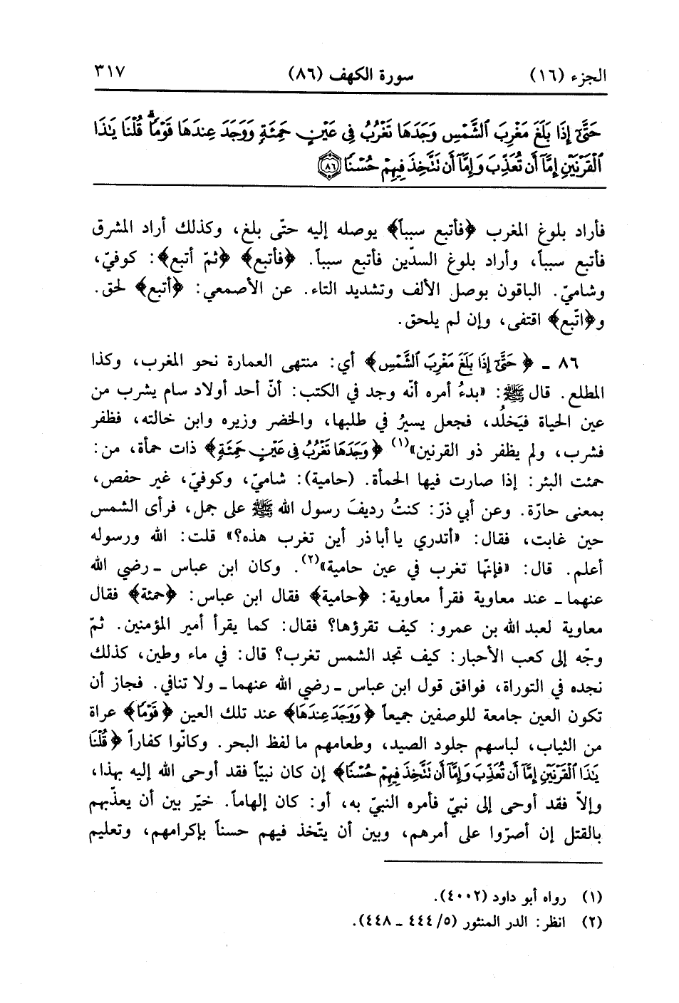 {حتى إِذَا بَلَغَ مَغْرِبَ الشمس} أي منتهى العمارة نحو المغرب وكذا المطلع قال صلى الله عليه وسلم بدء أمره أنه وجد في الكتب أن أحد أولاد سام يشرب من عين الحياة فيخلد فجعل يسير في طلبها والخضر وزيره وابن خالته فظفر فشرب ولم يظفر ذو القرنين {وَجَدَهَا تَغْرُبُ فِى عَيْنٍ حَمِئَةٍ} ذات حمأة من حمئت البئر إذا صارت فيها الحمأة حامية شامي وكوفي غير حفص بمعنى حارة وعن أبي ذر كنت رديف رسول الله صلى الله عليه وسلم على جمل فرأى الشمس حين غابت فقال أتدري يا أبا ذر أين تغرب هذه قلت الله ورسوله أعلم قال فإنها تغرب في عين حمئة وكان ابن عباس رضي الله عنهما عند معاوية فقرأ معاوية حامية فقال ابن عباس حمئة فقال معاوية لعبد الله بن عمر كيف تقرؤها فقال كما يقرأ أمير المؤمنين ثم وجه إلى كعب الأحبار كيف تجد الشمس تغرب قال في ماء وطين كذلك نجد في التوارة فوافق قول ابن عباس رضي الله عنهما ولا تنافي فجازان تكون العين جامعة للوصفين جميعاً {وَوَجَدَ عِندَهَا} عند تلك العين {قَوْماً} عراة من الثياب لباسهم جلود الصيد وطعامهم ما لفظ البحر وكانوا كفارا {قلنا يا ذا القرنين إِمَّا أَن تُعَذّبَ وَإِمَّا أَن تَتَّخِذَ فِيهِمْ حُسْناً} إن كان نبياً فقد أوحى الله إليه بهذا وإلا فقد أوحي إلى نبي فأمره النبي به أو كان إلهاماً خير بين أن يعذبهم بالقتل إن أصروا على أمرهم وبين أن يتخذ فيهم حسناً بإكرامهم وتعليم