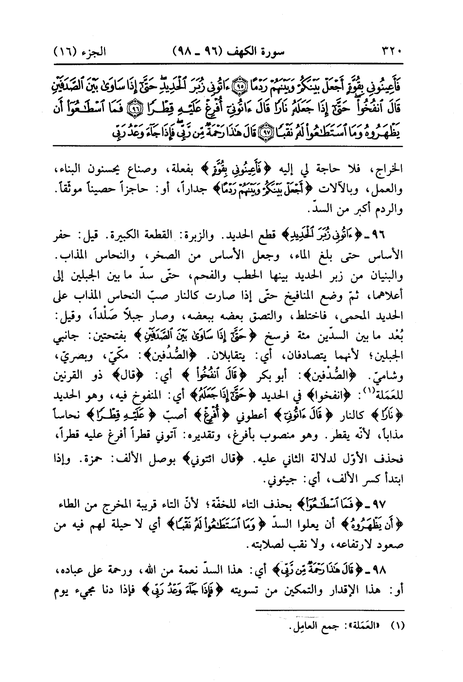 آتُونِي زُبَرَ الْحَدِيدِ حَتَّى إِذَا سَاوَى بَيْنَ الصَّدَفَيْنِ قَالَ انْفُخُوا حَتَّى إِذَا جَعَلَهُ نَارًا قَالَ آتُونِي أُفْرِغْ عَلَيْهِ قِطْرًا (96)