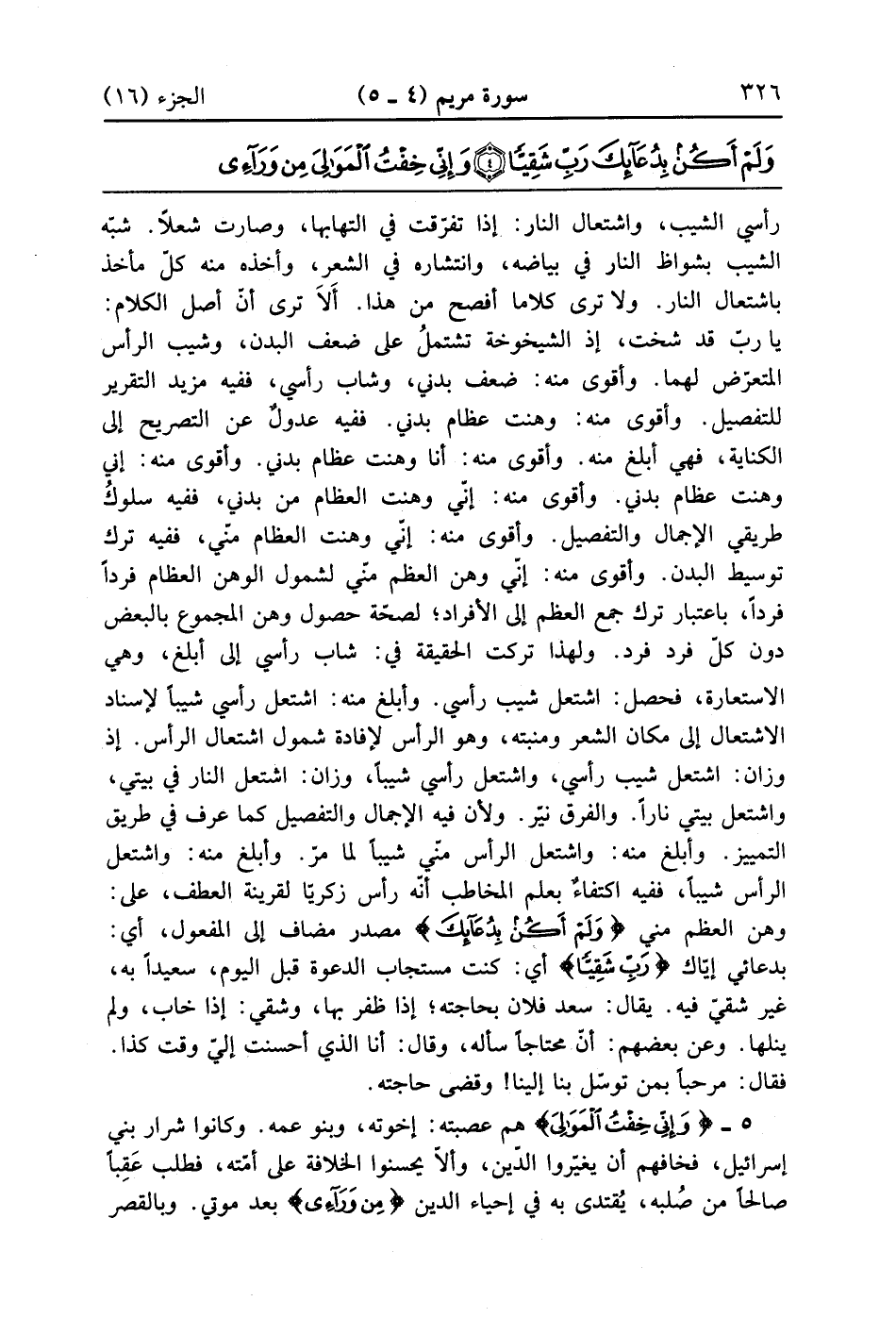 رأسي الشيب واشتعلت النار إذا تفرقت في التهابها وصارت شعلا شبه الشيب بشواظ النار في بياضه وانتشاره في الشعر وأخذه منه كل ما أخذ باشتعال النار ولا ترى كلاماً أفصح من هذا ألا ترى أن أصل الكلام يا رب قد شخت إذ الشيخوخة تشتمل على ضعف البدن وشيب الرأس المتعرض لها وأقوى منه ضعف بدني وشاب رأسي ففيه مزيد والتقرير للتفصيل وأقوى منه وهنت عظام بدني ففه عدول عن التصريح إلى الكناية فهي أبلغ منه وأقوى منه أنا وهنت عظام بدني وأقوى منه إني وهنت بدني وأقوى منه إني وهنت العظام من بدني ففيه سلوك طريقي الإجمال والتفصيل وأقوى منه إني وهنت العظام مني ففيه ترك توسيط البدن وأقوى منه إني وهن العظم مني لشمول الوهن العظام فرداً فرداً باعتبار ترك جمع العظم إلى الإفراد لصحه حصول وهن المجموع بالبعض دون كل فرد فرد ولهذا تركت الحقيقة في شاب رأسي إلى أبلغ وهي الاستعارة فحصل اشتعل شيب رأسي وأبلغ منه اشتعل رأسي شيباً لإسناد الاشتعال إلى مكان الشعر ومنبته وهو الرأس لإفادة شمول الاشتعال الرأس إذ وزان اشتعل