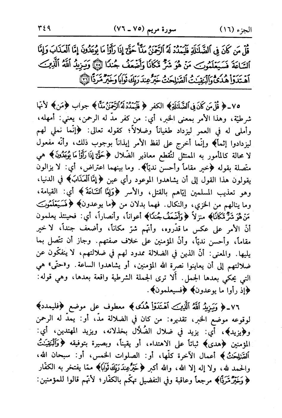 قُلْ مَنْ كَانَ فِي الضَّلَالَةِ فَلْيَمْدُدْ لَهُ الرَّحْمَنُ مَدًّا حَتَّى إِذَا رَأَوْا مَا يُوعَدُونَ إِمَّا الْعَذَابَ وَإِمَّا السَّاعَةَ فَسَيَعْلَمُونَ مَنْ هُوَ شَرٌّ مَكَانًا وَأَضْعَفُ جُنْدًا (75)