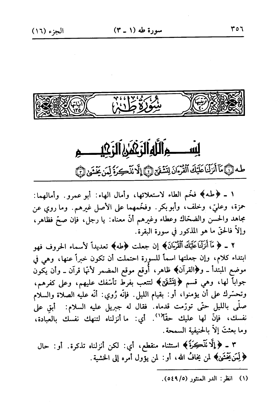 {طه} فخم الطاء لاستعلائها وأمال الهاء أبو عمرو وأمالهما حمزة وعلي وخلف وأبو بكر وفخمهما على الأصل غيرهم وما رُوي عن مجاهد والحسن والضحاك وعطاء وغيرهم أن معناه يا رجل فإن صح فظاهر وإلا فالحق ما هو المذكور في سورة البقرة