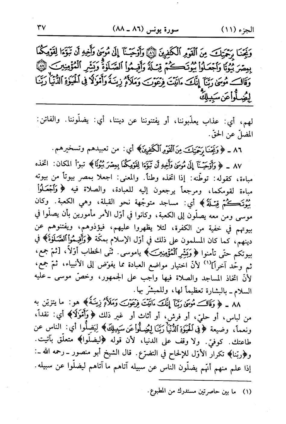 وَأَوْحَيْنَا إِلَى مُوسَى وَأَخِيهِ أَنْ تَبَوَّآ لِقَوْمِكُمَا بِمِصْرَ بُيُوتًا وَاجْعَلُوا بُيُوتَكُمْ قِبْلَةً وَأَقِيمُوا الصَّلَاةَ وَبَشِّرِ الْمُؤْمِنِينَ (87)