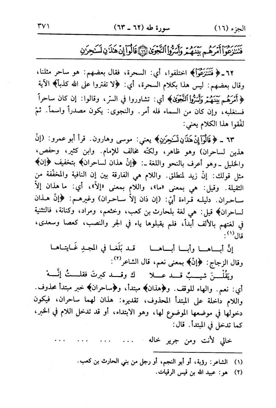 {قالوا إن هذان لساحران} يعني موسى وهرون قرأ أبو عمر إن هَذينِ لساحران وهو ظاهر ولكنه مخالف للإمام وابن كثير وحفص والخليل وهو أعرف بالنحو واللغة ان هذان لساحران بتخفيف إن مثل قولك إن زيد لمنطلق واللام هي الفارقة بين إن النافية والمخففة والثقيلة وقيل هي بمعنى ما واللام بمعنى إلا أي ما هذان إلا ساحران دليله قراءة أبي أن هذان إلا ساحران وغيرهم إن هذان لساحران قيل هي لغة بلحارث بن كعب وخثعم ومراد وكنانة فالتثنية في لغتهم بالألف أبداً فلم يقلبوها ياء في الجر والنصب كعصا وسعدى قال ... إن أباها وأبا أباها ... قد بلغ في المجد غايتاها ...