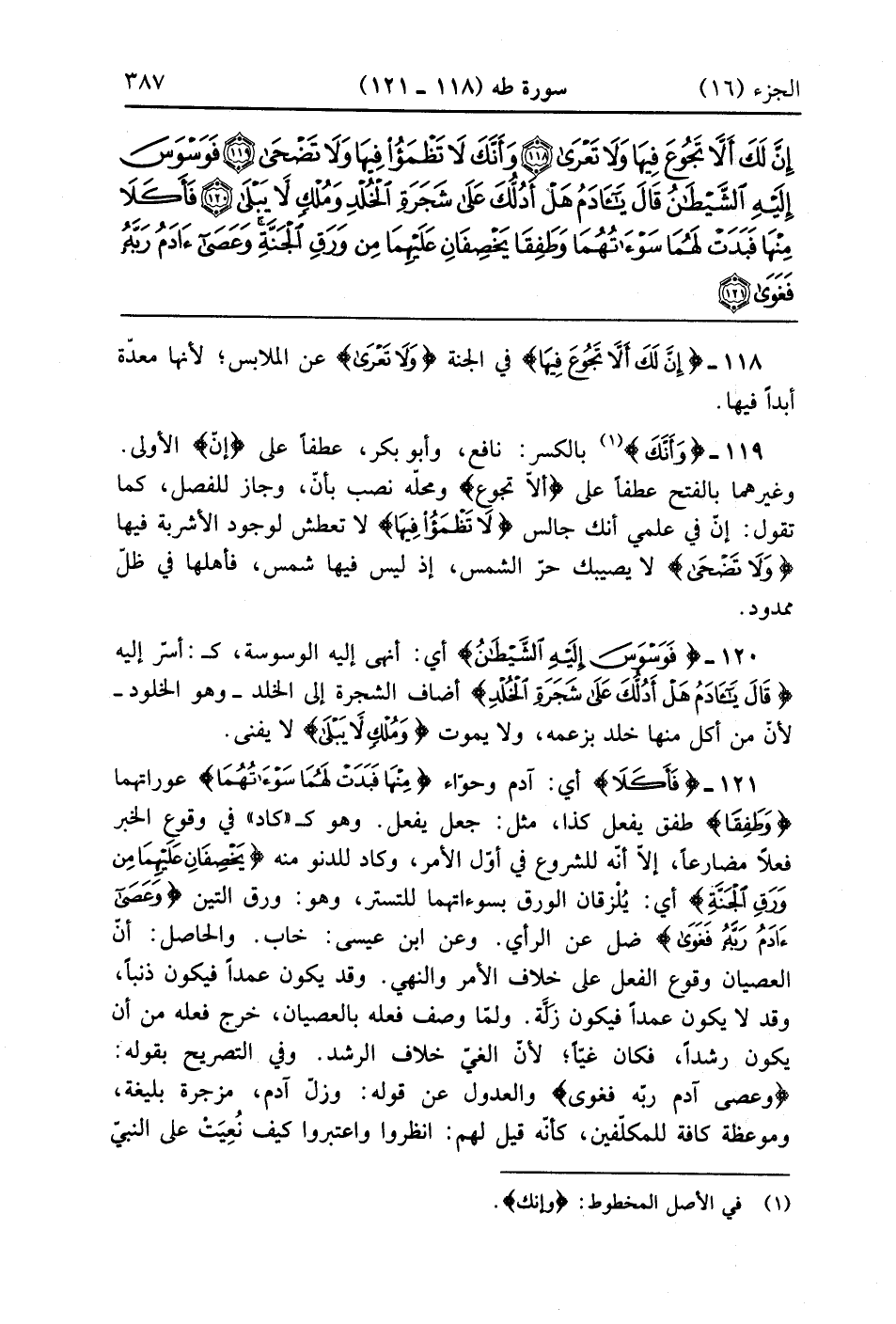 فَأَكَلَا مِنْهَا فَبَدَتْ لَهُمَا سَوْآتُهُمَا وَطَفِقَا يَخْصِفَانِ عَلَيْهِمَا مِنْ وَرَقِ الْجَنَّةِ وَعَصَى آدَمُ رَبَّهُ فَغَوَى (121)