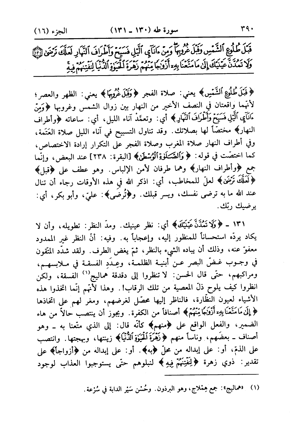 {قَبْلَ طُلُوعِ الشمس} يعني صلاة الفجر {وَقَبْلَ غُرُوبِهَا} يعني الظهر والعصر لأنهما واقعتان في النصف الأخير من النهار بين زوال الشمس وغروبها {ومن آناء الليل فسبّح وأطراف النهار} أي وتعهد أناء أي ساعاته وأطراف النهار مختصاً لها بصلاتك وقد تناول التبسيح في آناء الليل صلاة العتمة وفي أطراف النهار صلاة المغرب وصلاة الفجر على التكرار إرادة الاختصاص كما اختصت في قوله والصلاة الوسطى عند البعض وإنام جمع أطراف النهار وهما طرفان لا من الإلباس وهو عطف على قبل {لَعَلَّكَ ترضى} لعل المخاطب أي اذكر الله في هذه الأوقات رجاء أن تنال عند الله ما به ترضى نفسك ويسر قلبك وترضى علي وأبو بكر أي يرضيك ربك