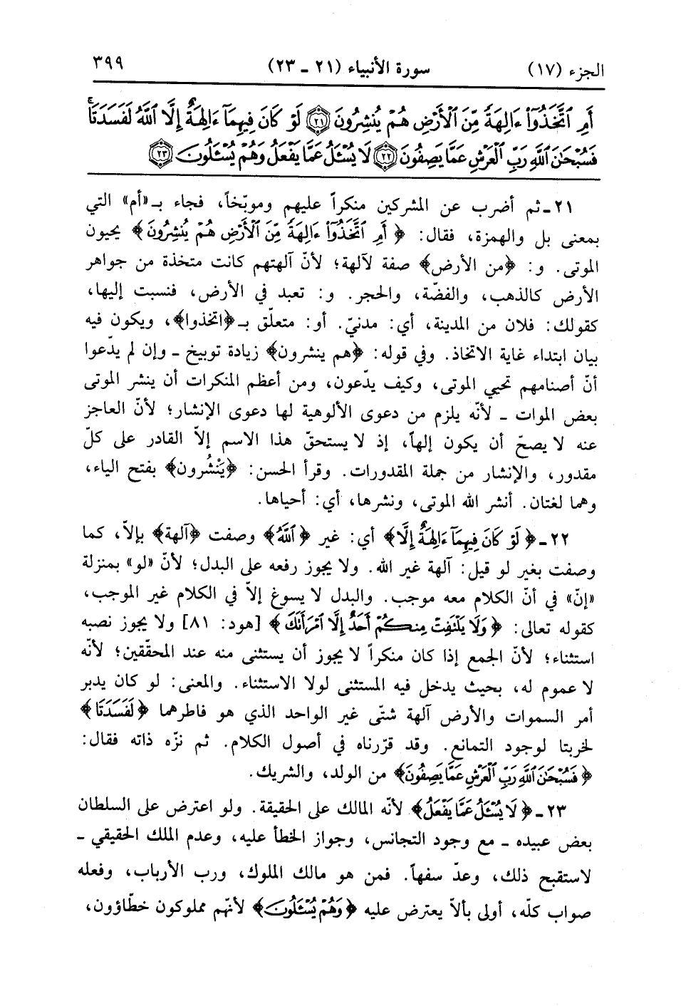 لَوْ كَانَ فِيهِمَا آلِهَةٌ إِلَّا اللَّهُ لَفَسَدَتَا فَسُبْحَانَ اللَّهِ رَبِّ الْعَرْشِ عَمَّا يَصِفُونَ (22)
