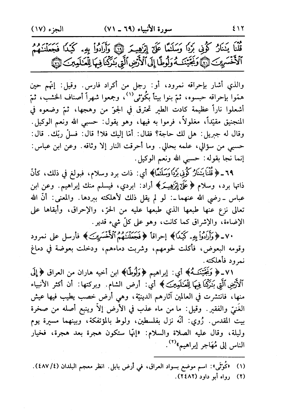 والذي أشار باحراقه نمرود أو رجل من أكراد فارس وقيل إنهم حين هموا بإحراقه حبسوه ثم بنوا بيتاً بكوثى وجمعوا شهرا اصناف الخشب ثم اشتعلوا ناراً عظيمة كادت الطير تحترق في الجو من وهجها ثم وضعوه في المنجنيق مقيداً مغلولاً فرموا به فيها وهو يقول حسبي الله ونعم الوكيل وقال لله جبريل هل لك حاجة فقال أما إليك فلا قال فسل ربك قال حسبي من سؤالي علمه بحالي وما أحرقت النار إلا وثاقه وعن ابن عباس إنما نجا بقوله حسبي الله ونعم الوكيل
