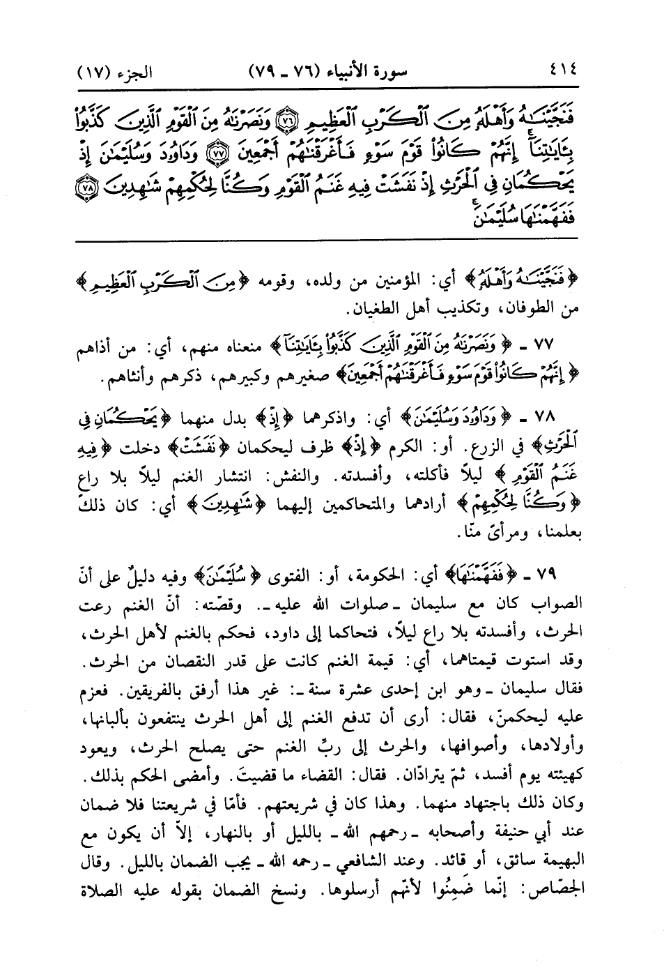 وَدَاوُودَ وَسُلَيْمَانَ إِذْ يَحْكُمَانِ فِي الْحَرْثِ إِذْ نَفَشَتْ فِيهِ غَنَمُ الْقَوْمِ وَكُنَّا لِحُكْمِهِمْ شَاهِدِينَ (78)