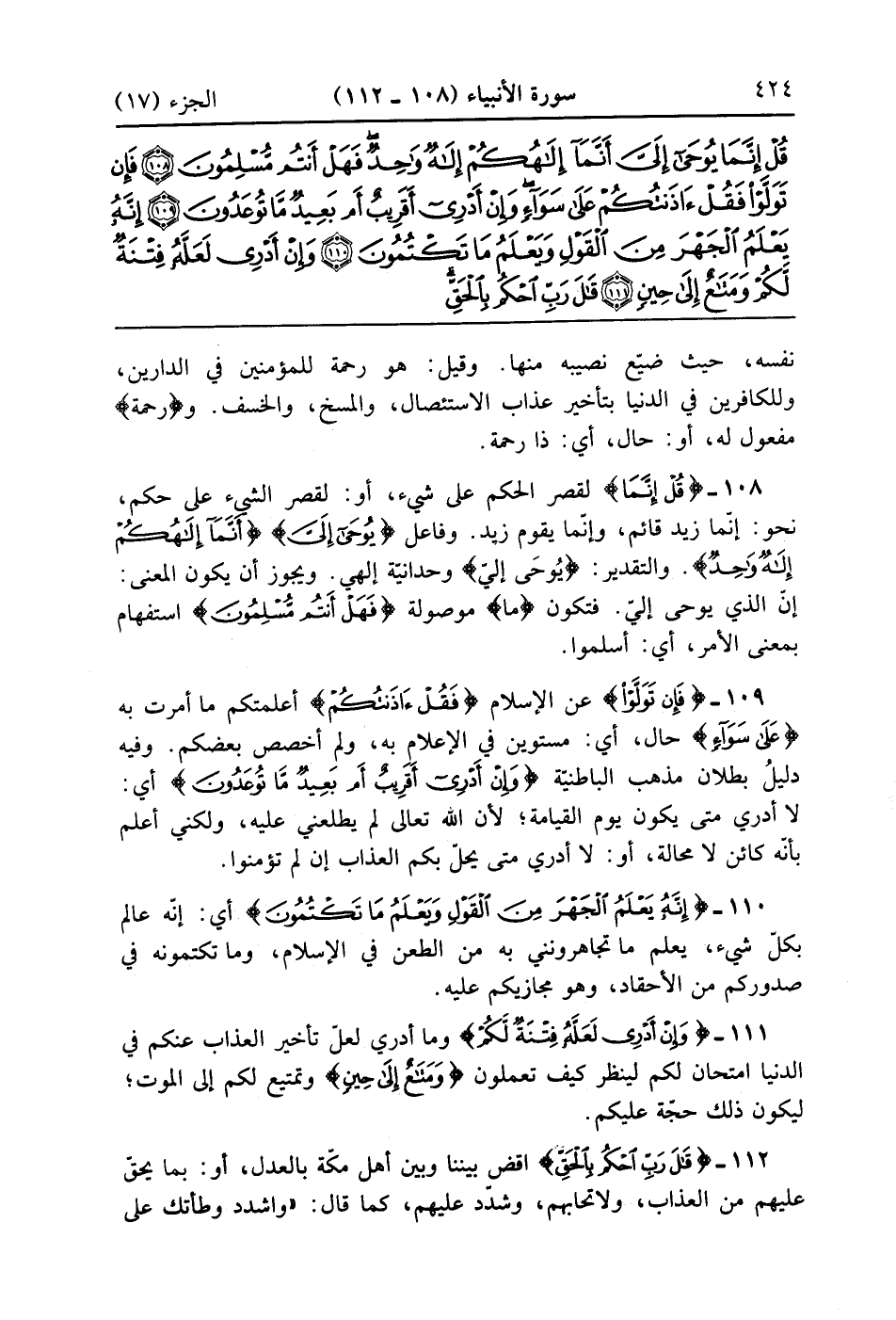 قُلْ إِنَّمَا يُوحَى إِلَيَّ أَنَّمَا إِلَهُكُمْ إِلَهٌ وَاحِدٌ فَهَلْ أَنْتُمْ مُسْلِمُونَ (108)