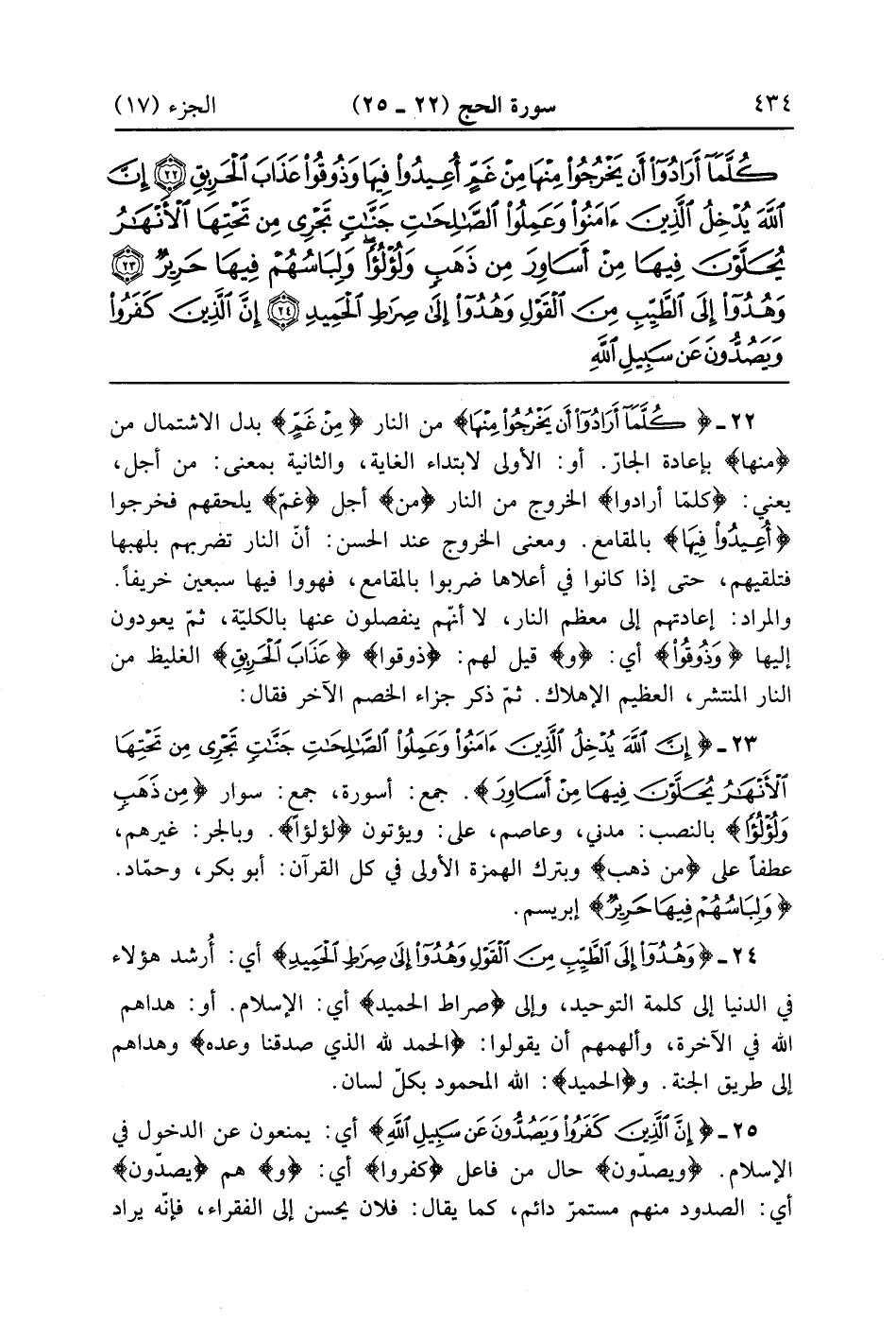 إِنَّ اللَّهَ يُدْخِلُ الَّذِينَ آمَنُوا وَعَمِلُوا الصَّالِحَاتِ جَنَّاتٍ تَجْرِي مِنْ تَحْتِهَا الْأَنْهَارُ يُحَلَّوْنَ فِيهَا مِنْ أَسَاوِرَ مِنْ ذَهَبٍ وَلُؤْلُؤًا وَلِبَاسُهُمْ فِيهَا حَرِيرٌ (23)