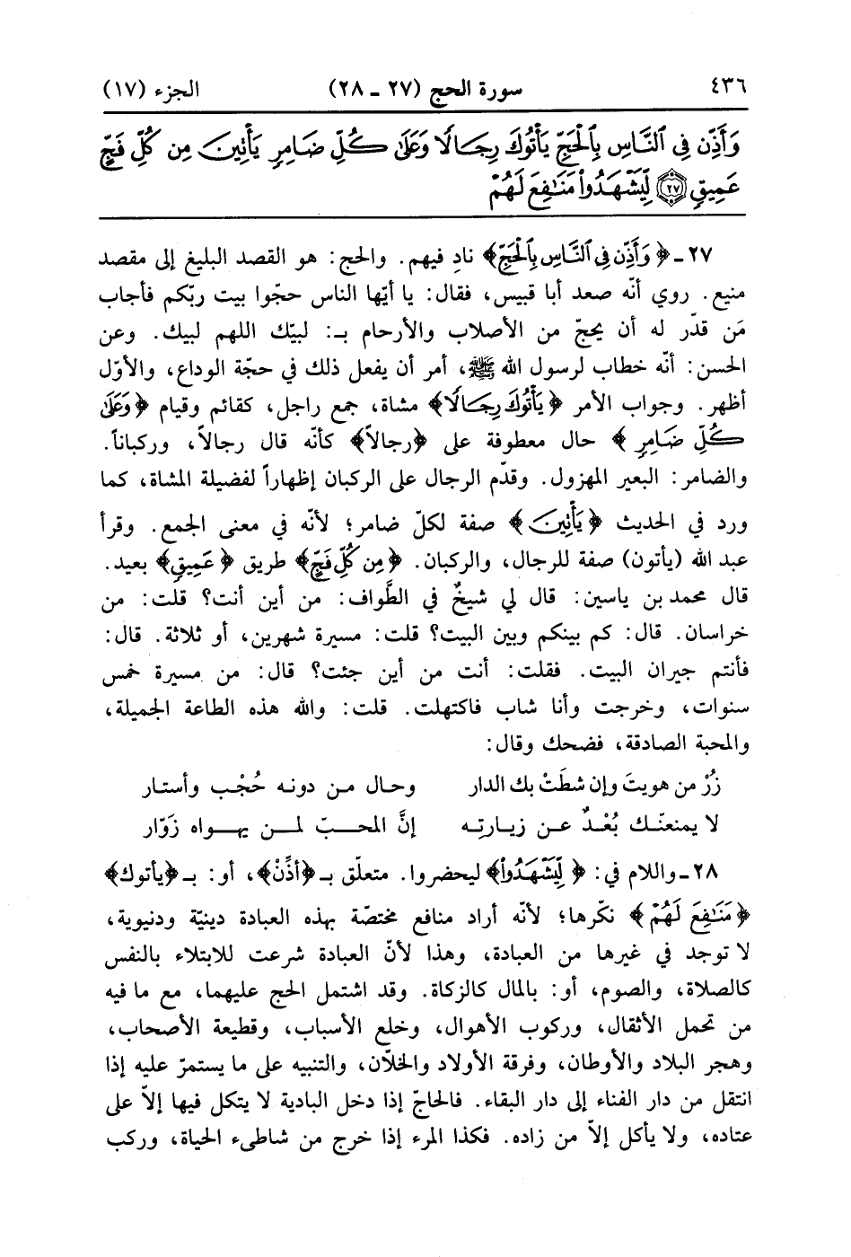 وَأَذِّنْ فِي النَّاسِ بِالْحَجِّ يَأْتُوكَ رِجَالًا وَعَلَى كُلِّ ضَامِرٍ يَأْتِينَ مِنْ كُلِّ فَجٍّ عَمِيقٍ (27)