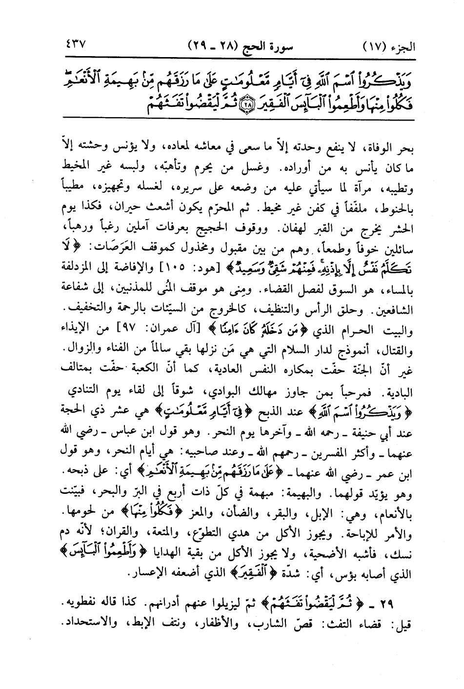 بحر الوفاة لاينفع وحدته إلا ما سعى في معاشه لمعاده ولا يؤنس وحشته إلا ما كان يأنس به من أوراده وغسل من يحرم وتأهبه ولبسه غير المخيط وتطيبه مرآة لما سيأتي عليه من وضعه على سريره لغسله وتجهيزه مطيباً بالحنوط ملففاً في كفن غير مخيط ثم المحرم يكون أشعث حيران فكذا يوم الحشر يخرج من القبر لهفان ووقوف الحجيج بعرفات آملين رغباً ورهباً سائلين خوفاً وطمعاً وهم من بين مقبول ومخذول كموقف العرصات لاَ تَكَلَّمُ نَفْسٌ إِلاَّ بِإِذْنِهِ فَمِنْهُمْ شَقِيٌّ وسعيد والإفاضة إلى المزدلفة بالمساء هو السوق لفصل القضاء ومنى هو موقف المنى للمذنبين إلى شفاعة الشافعين وحلق الرأس والتنظيف كالخروج من السيئات بالرحمة والتخفيف والبيت الحرم الذي من دخله كان آمناً من الإيذاء والقتال أنموذج لدار السلام التي هي من نزلها بقي سالماً من الفناء والزوال غير أن الجنة حفت بمكاره النفس العادية كما أن الكعبة حفت بمتالف البادية فمرحباً بمن جاوز مهالك البوادي شوقاً إلى اللقاء يوم التنادي {وَيَذْكُرُواْ اسم الله} عند الذبح {فِى أَيَّامٍ معلومات} هي عشر ذي الحجة عند أبى حنيفة رحمه الله وآخرها يوم النحر وهو قول ابن عباس رضى الله عنهما وأكثر المفسرين رحمهم الله وعند صاحبيه هي أيام النحر وهو قول ابن عمر رضى الله عنهما {على مَا رَزَقَهُمْ مّن بَهِيمَةِ الأنعام} أي على ذبحه وهو يؤيد قولهما والبهيمة في كل ذات أربع في البر والبحر فبيتت بالأنعام وهي الإبل والبقر والضأن والمعز {فَكُلُواْ مِنْهَا} من لحومها والأمر للإباحة ويجوز الأكل من هدي التطوع والمتعة والقران لأنه دم نسك فأشبه الأضحية ولا يجوز الأكل من بقية الهدايا {وَأَطْعِمُواْ البائس} الذي أصابه بؤس أي شدة الفقير الذي أضعفه الإعسار