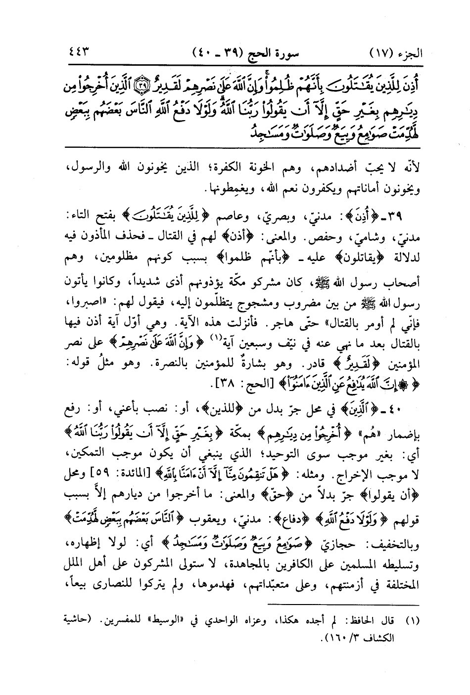 الَّذِينَ أُخْرِجُوا مِنْ دِيَارِهِمْ بِغَيْرِ حَقٍّ إِلَّا أَنْ يَقُولُوا رَبُّنَا اللَّهُ وَلَوْلَا دَفْعُ اللَّهِ النَّاسَ بَعْضَهُمْ بِبَعْضٍ لَهُدِّمَتْ صَوَامِعُ وَبِيَعٌ وَصَلَوَاتٌ وَمَسَاجِدُ يُذْكَرُ فِيهَا اسْمُ اللَّهِ كَثِيرًا وَلَيَنْصُرَنَّ اللَّهُ مَنْ يَنْصُرُهُ إِنَّ اللَّهَ لَقَوِيٌّ عَزِيزٌ (40)